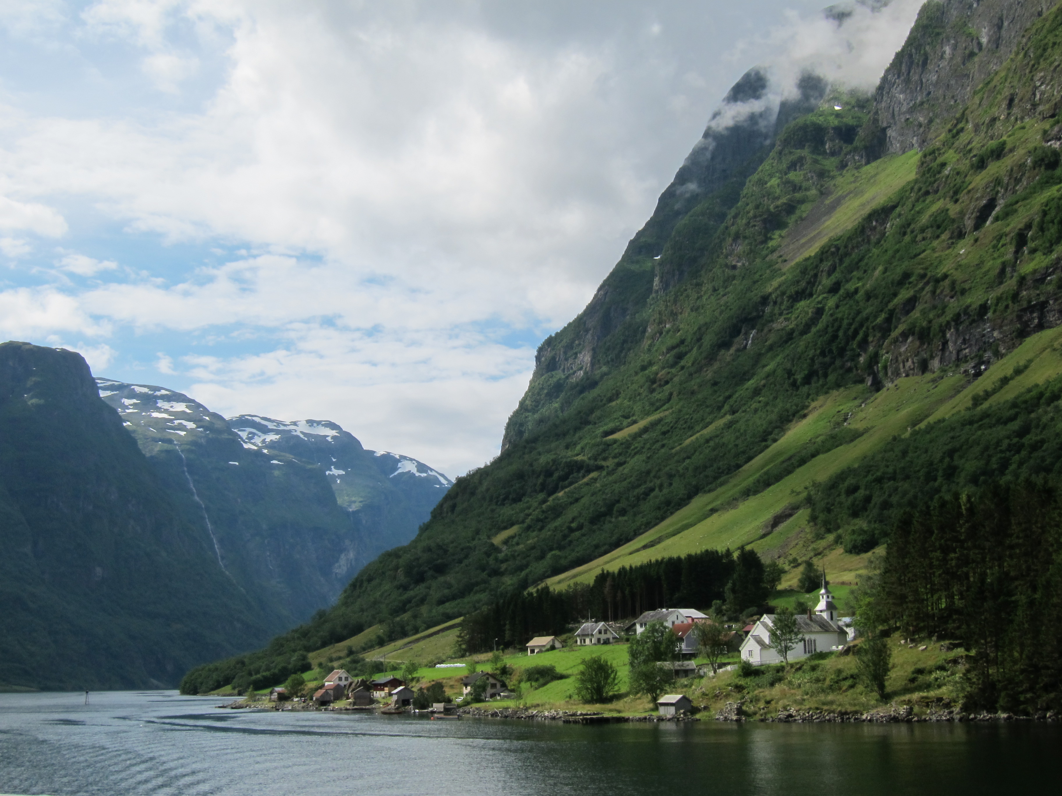 Waiting for the ferry at GudvangenOn board I have that feeling like this is going to be a special day.  The skies aren’t threatening any rain, and all around us are mountains.  As the ferry pulls away to start the voyage, this is the view looking back toward Gudvangen:
