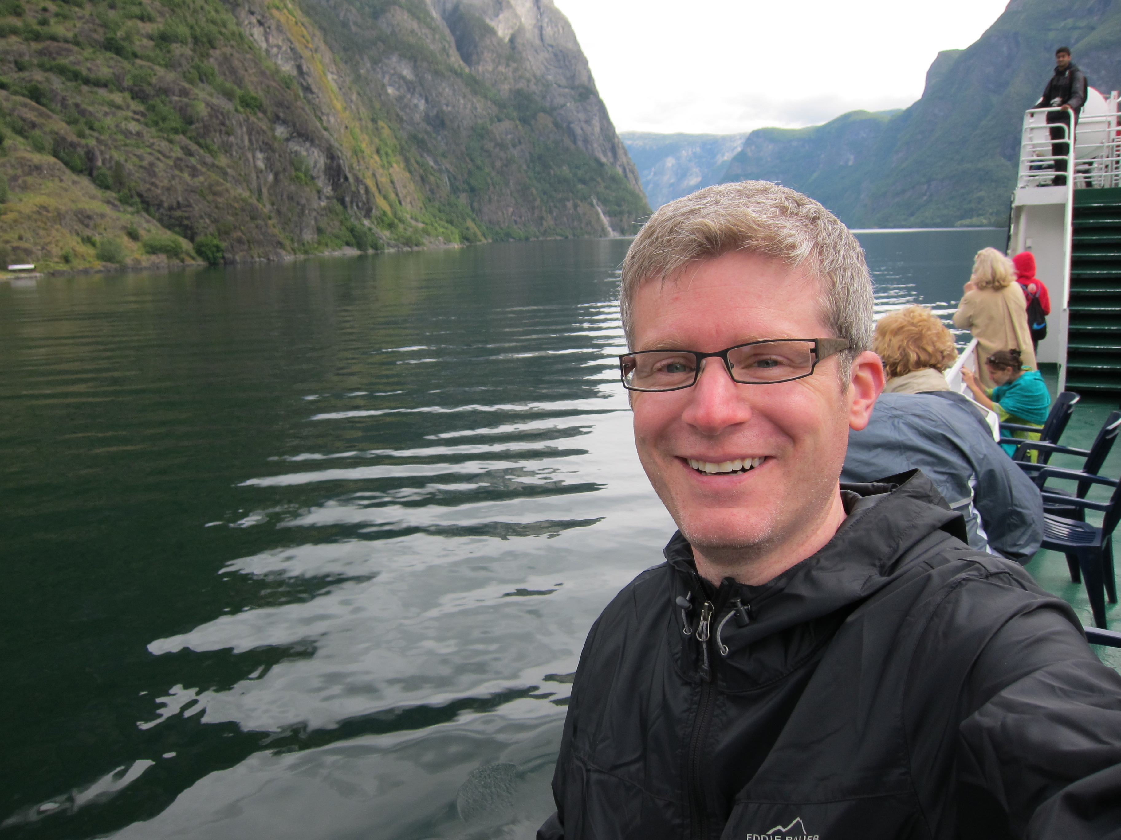 On the fjordsI have a few hundred pictures from the two hour voyage where the most common thing heard on board the boat was “wow!”.   Here I am on the top deck of the ferry about half way into the trip: