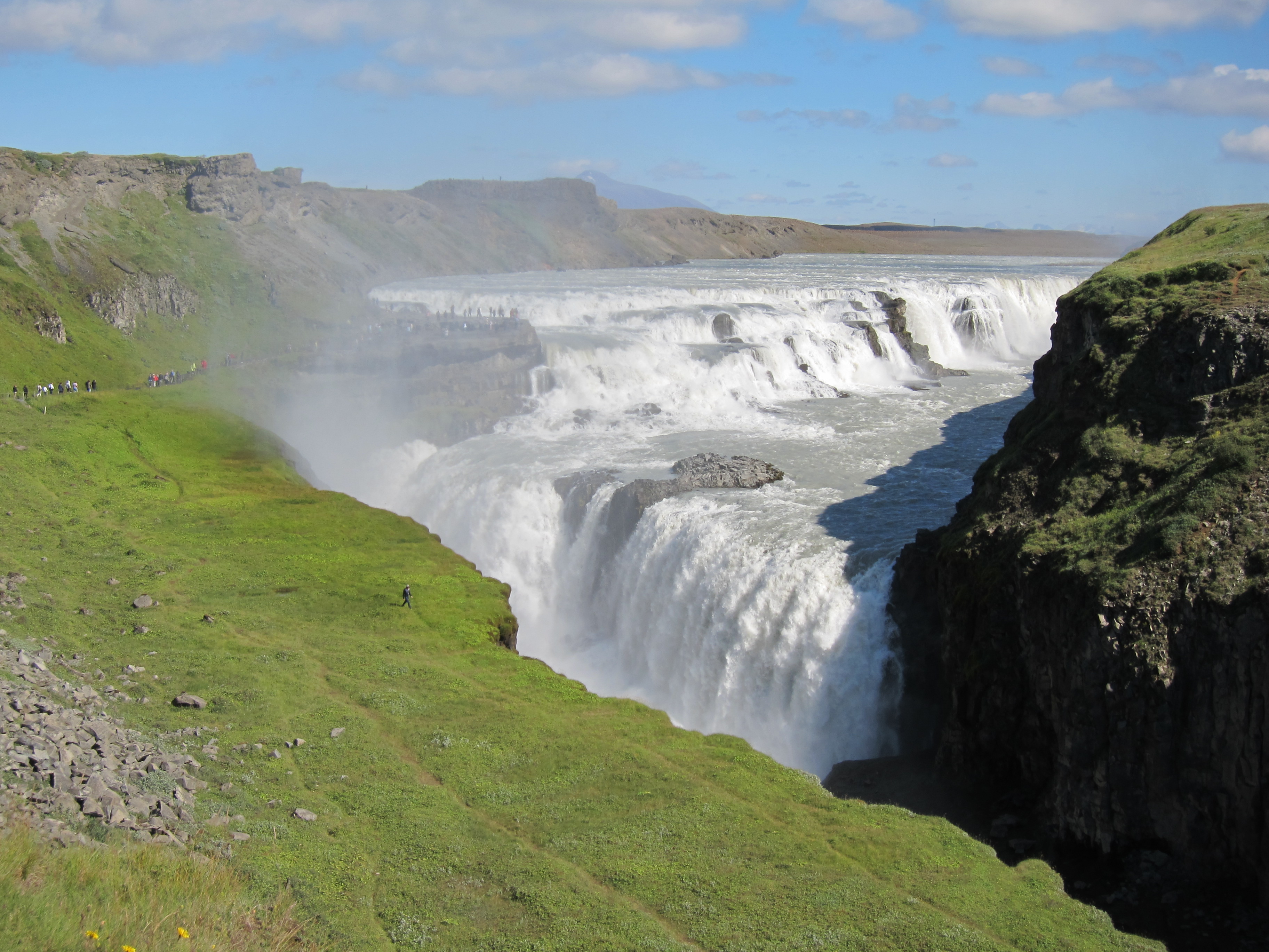 GullfossAs you’re walking toward this site, you see the Hvítá river, but it looks like it just disappears.  It’s not until you get closer that you actually see the falls.  The river’s sharp left turn and multiple falls over rock formations makes it spectacular: