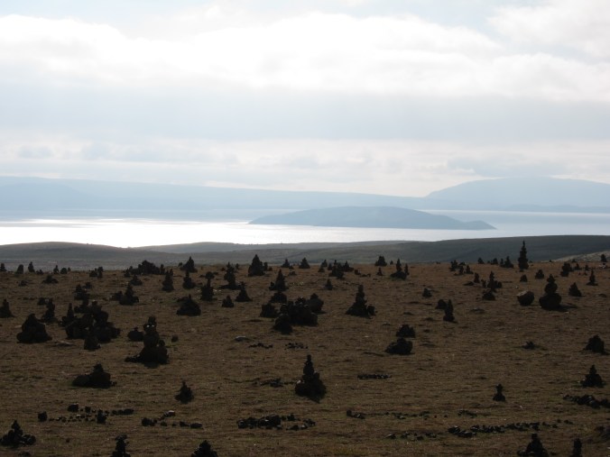 This is the second time I’ve crossed paths with balanced rock sculptures on my travels this year.   Here, the moon-like topography, the early morning chill in the air, and the water and mountains off in the distance combine for a tranquil first stop:
