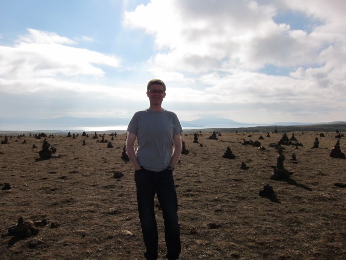 Leaving Reykjavik, there are clouds in the sky with a forecast promising a sunny day a few hours ahead.  With no trouble at all, we find our way out of the city and onto highway 36 to make our way to Þingvellir National Park.   We decided on the self-tour/rental car approach so we could do this trip at our own pace.  About 10-15 minutes after turning onto highway 36, we’re glad we did.  We pull off the highway for the first of what would be a few stops like this.  There is an open vista and a field of balanced rock sculptures done by visitors: