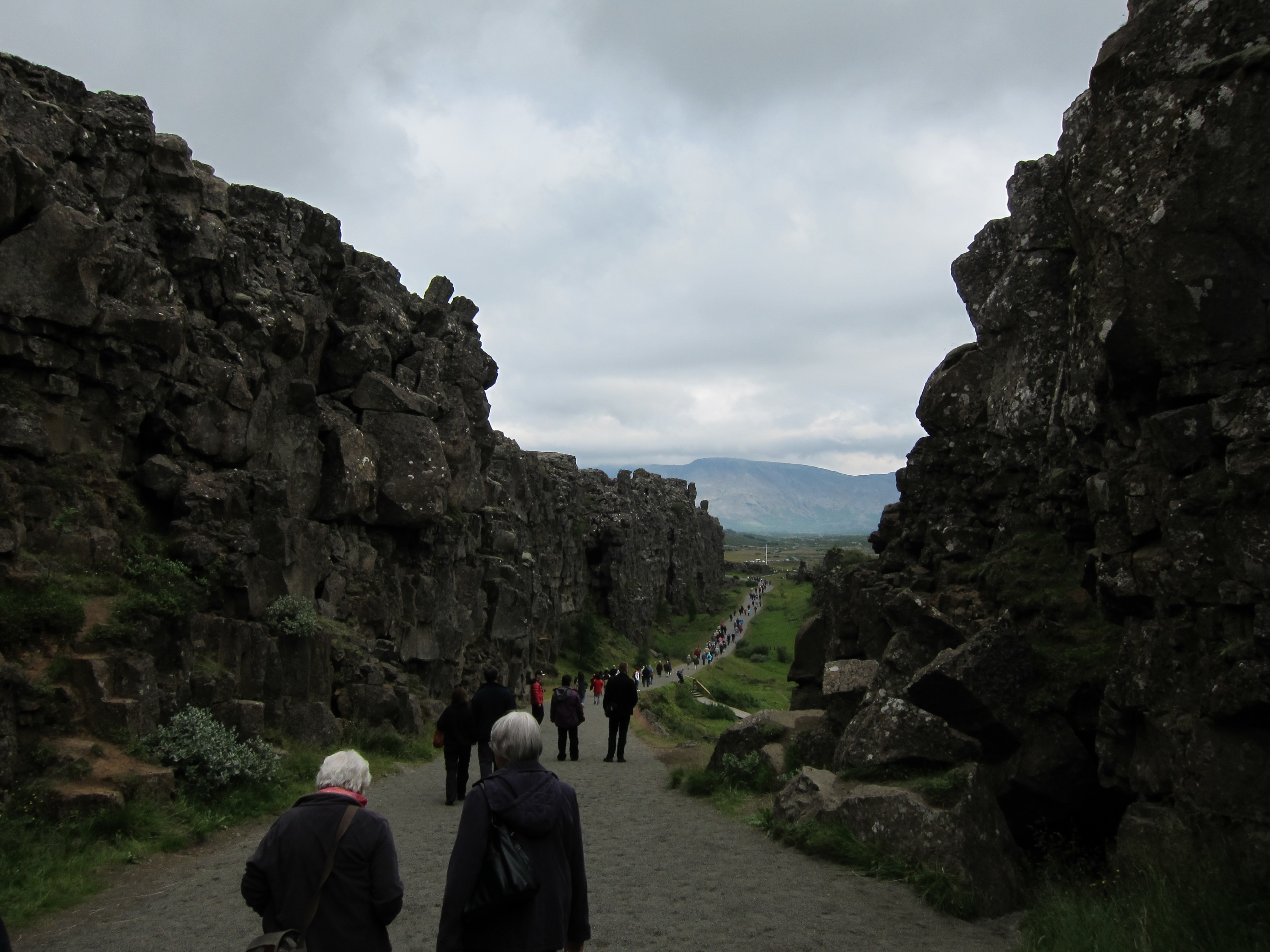 We hop back in the car, continually amazed by the views through the windshield.  The terrain is changing with each kilometre that passes.  We’re leaving the flat, barren land behind as we make our way closer to Þingvellir National Park.   This is the site of the first Icelandic Parliament from the year 930.  It’s also the place where the Eurasian and North-American tectonic plate boundaries are visible above ground.  These plates move about 2cm each year: