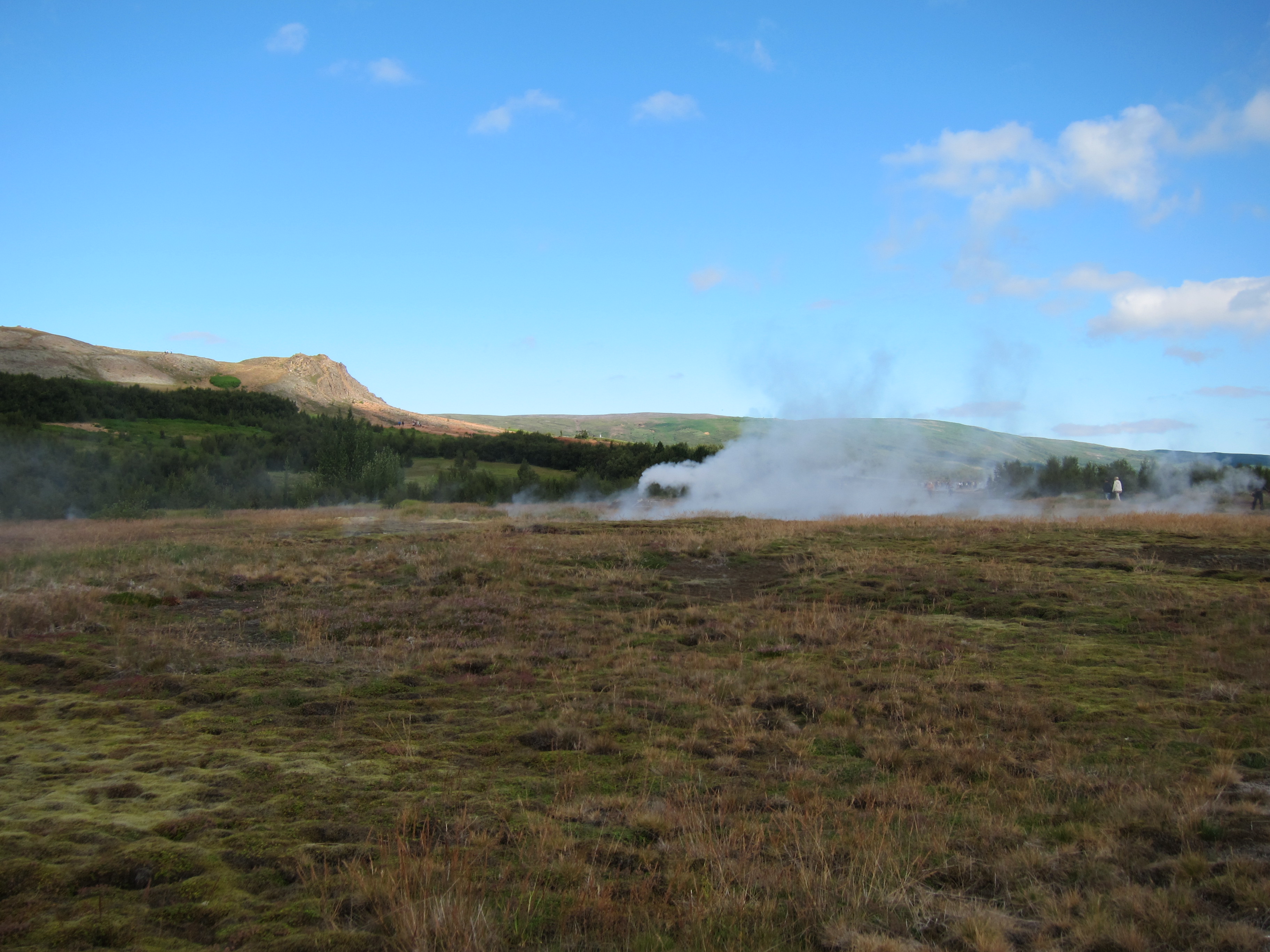 We arrive at Geysir maybe two hours after leaving Þingvellir (the wrong turn and pulling over a few times to take in the views lengthened the drive in a good way).  Right from the road you can see the steam coming up from the ground (there are signs warning you that the water temperature here is 80-100°C):