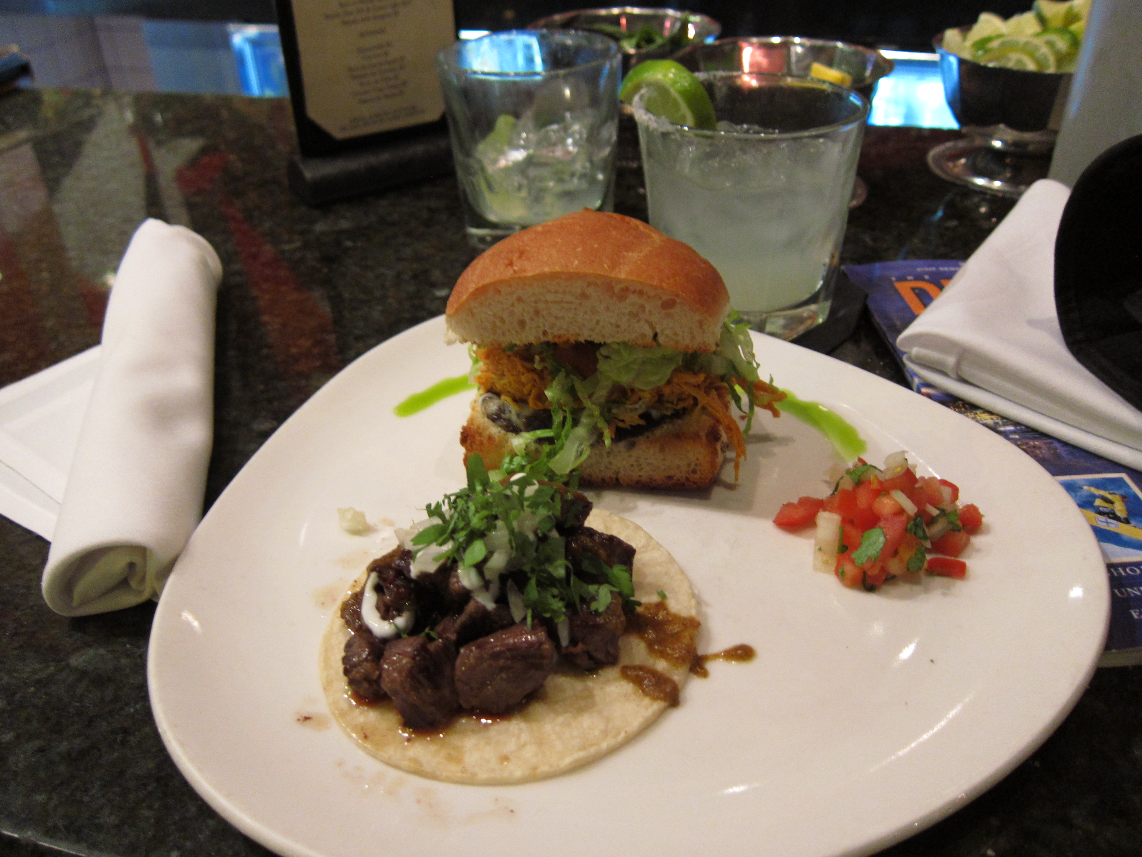 Tamayo – The second night in town had me stopping by this Mexican restaurant during their happy hour. A couple of margaritas and a sampling from their bar menu was a great way to kick off my evening. The mini chicken torta and a carne asada taco were both delicious. The guacamole and chips to start were so good I didn’t get a picture: