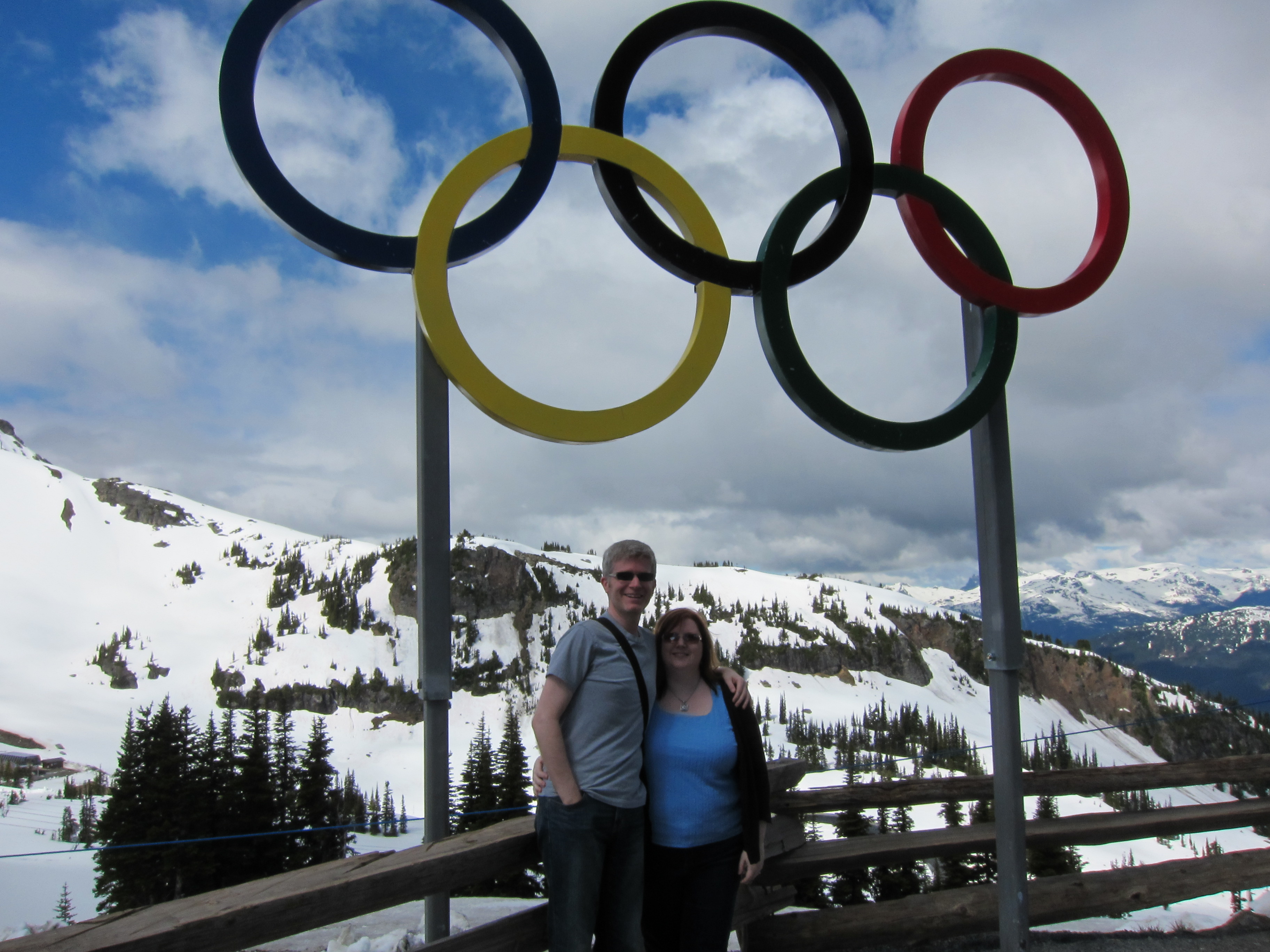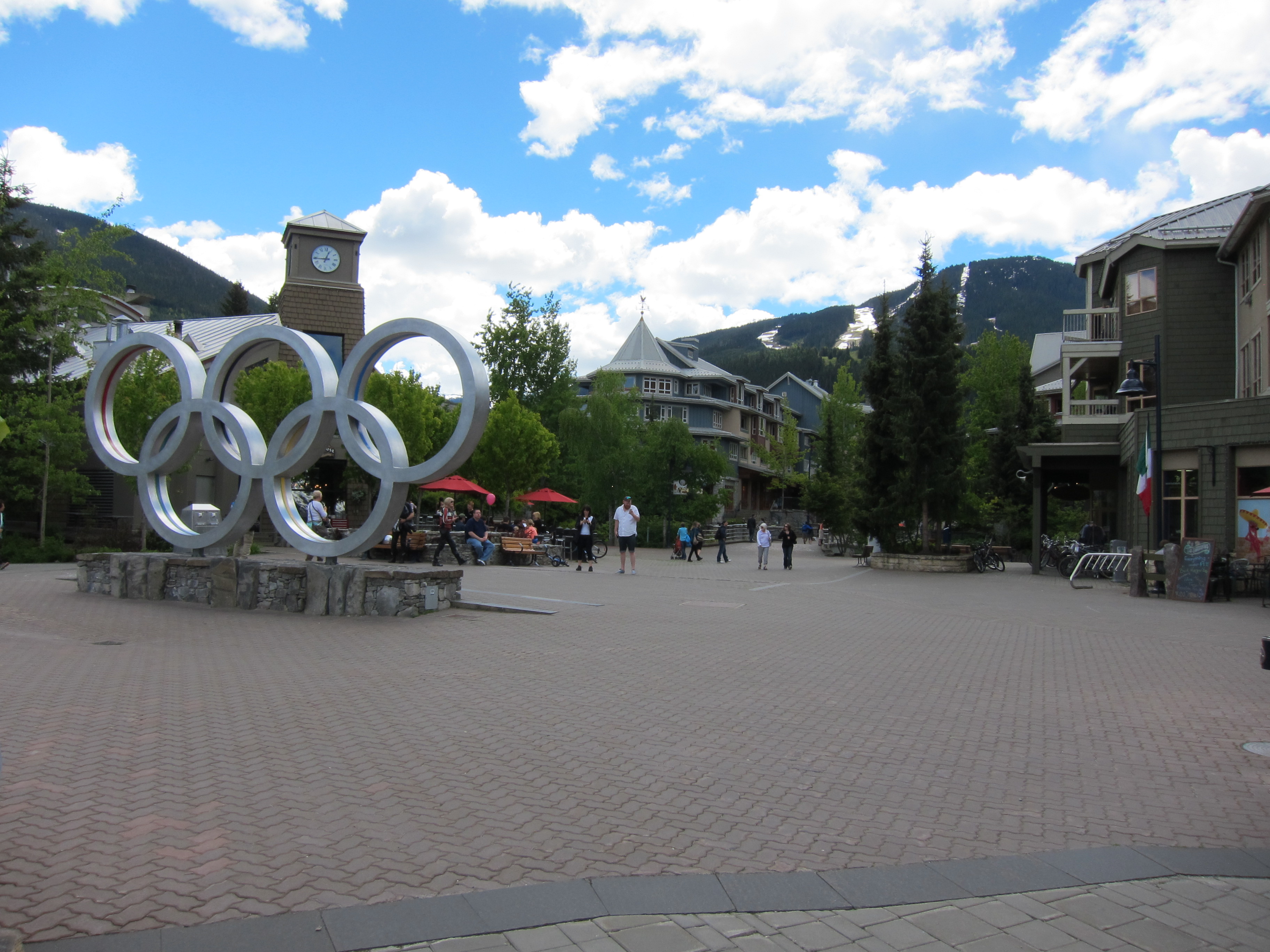A couple of return gondola rides got us back down to the village of Whistler. It’s a cute, stereotypical ski resort town. Lots of restaurants and bars and plenty of places to just relax and watch people walk by. Before stopping for lunch, we headed to the Olympic Plaza, the site of quite a few Canadian medal celebrations, perhaps none as famous as Jon Montgomery being handed a pitcher of beer walking through the town after his gold medal win in skeleton (also, for my money, the time the entire 2010 Olympics felt like it took a turn Canada’s way). Here are the Olympic rings with Whistler mountain in the background: