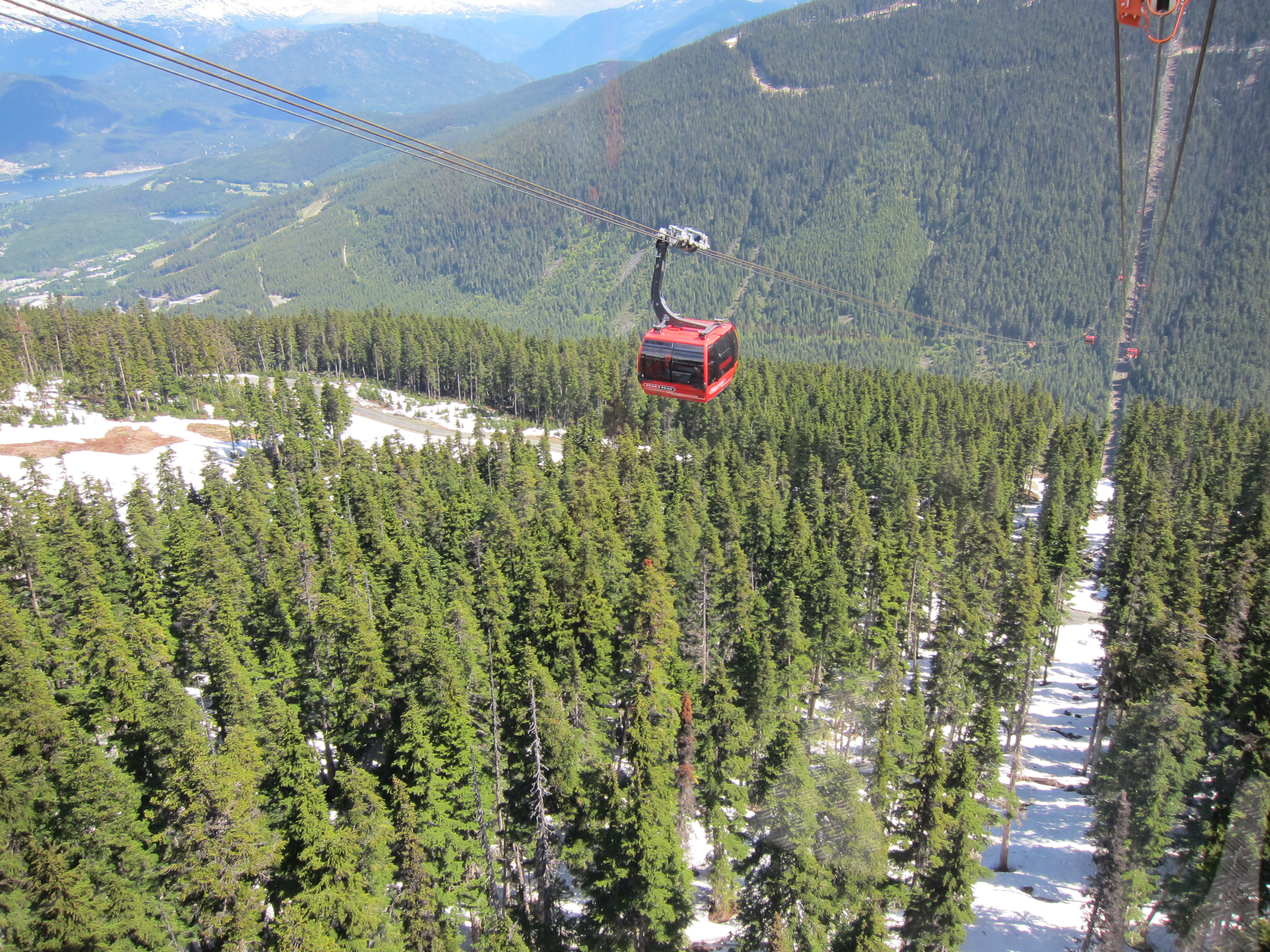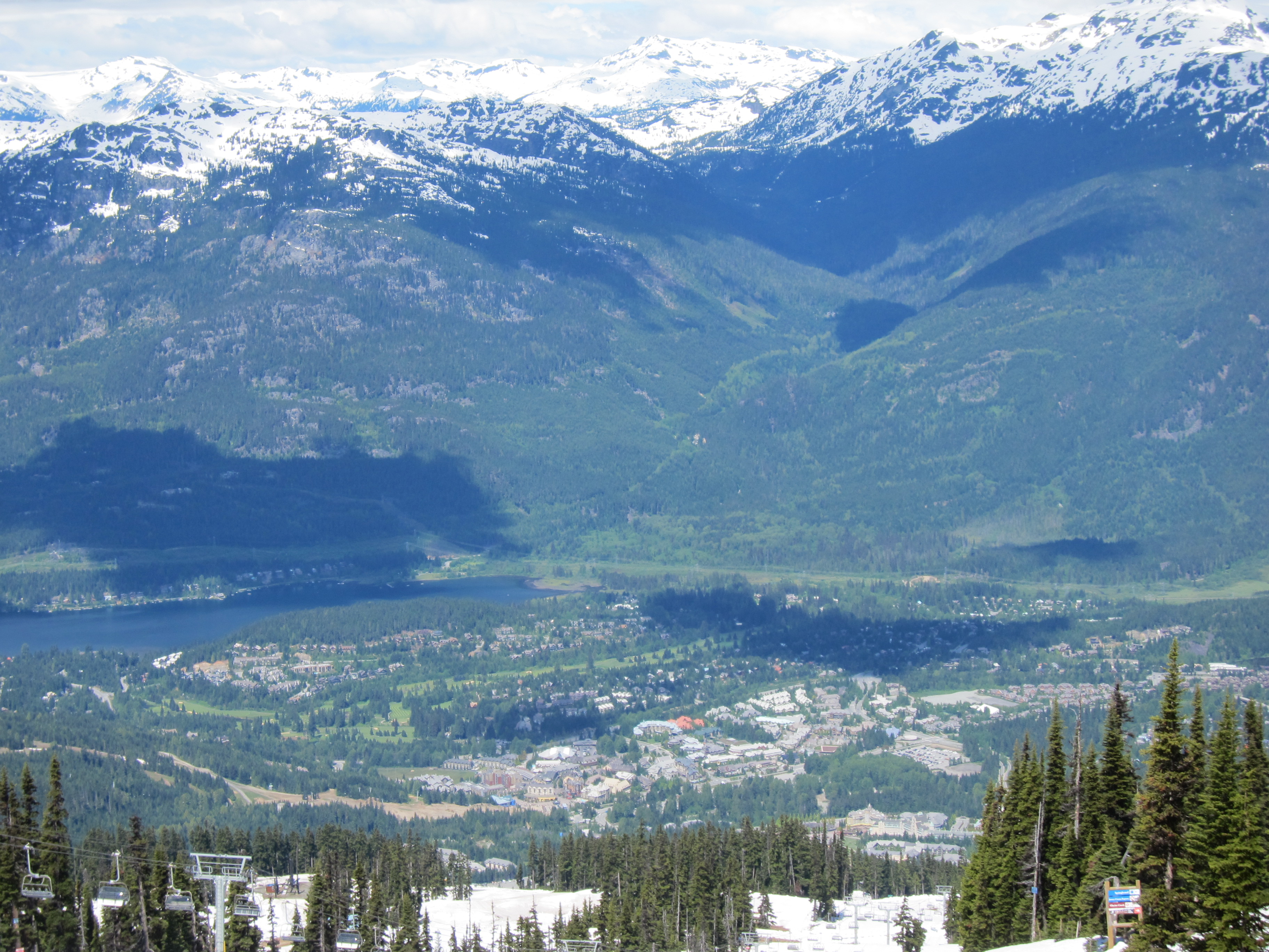 Our plan was to head up the mountain first thing. The crowds are thin and we snagged a cable car for just us. About half way up Whistler, this is the view back down toward the village: