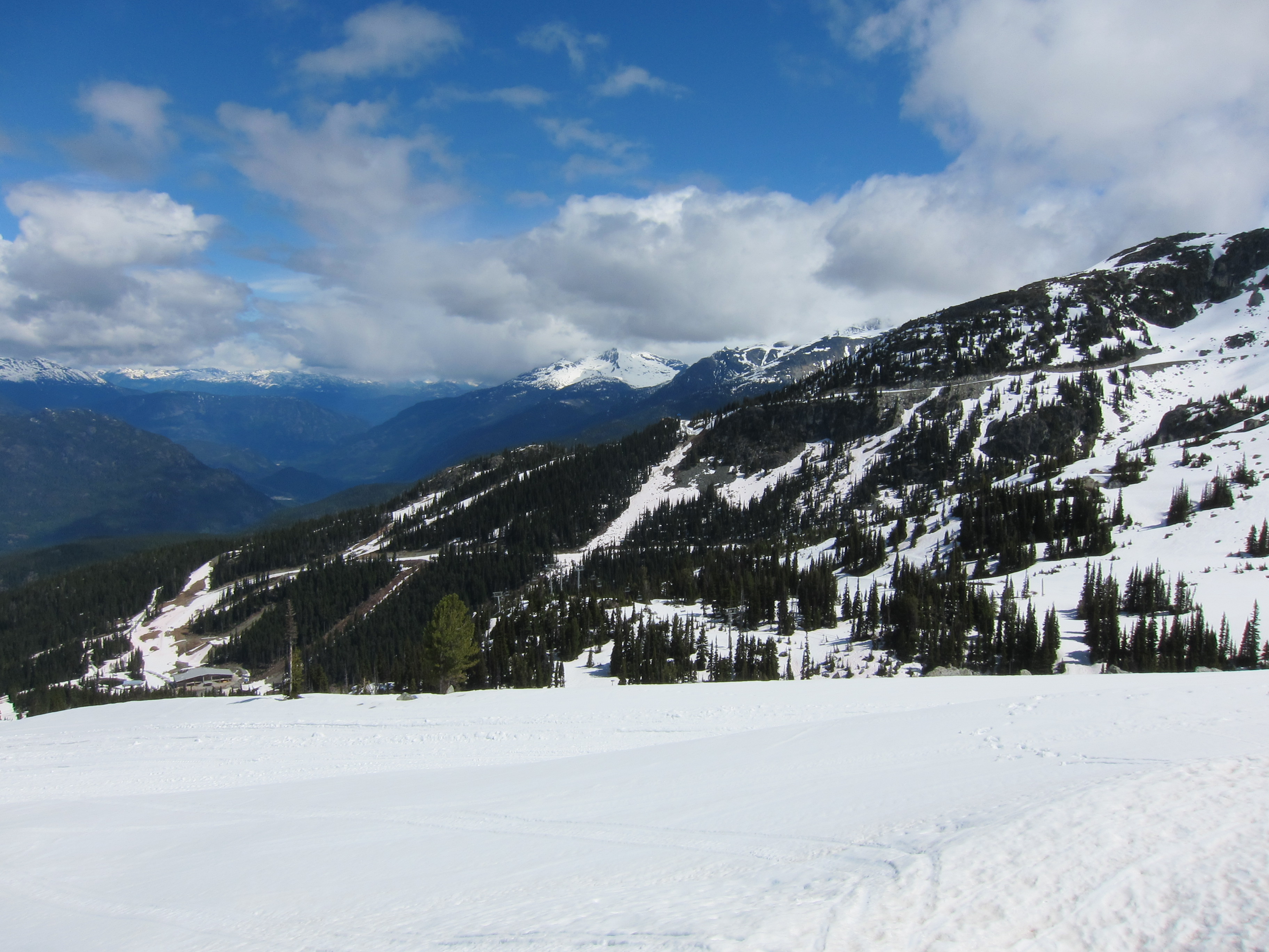 About that point in the journey, we moved up past the snow line. It was a couple of degrees above freezing, but there’s a pretty solid base of snow hanging around. Just before reaching the top of the mountain, we got this view over to Blackcomb which had an even deeper base of snow:
