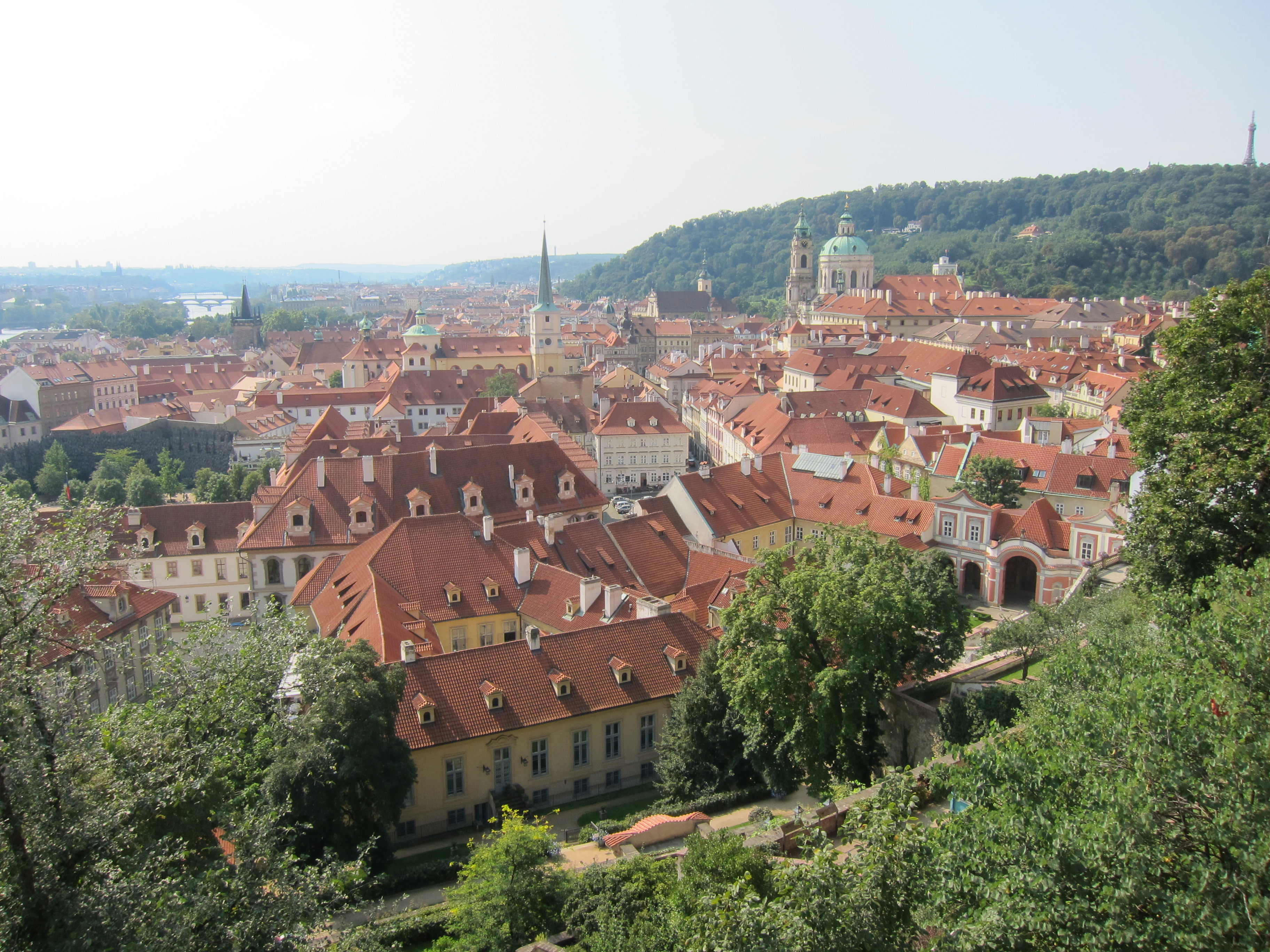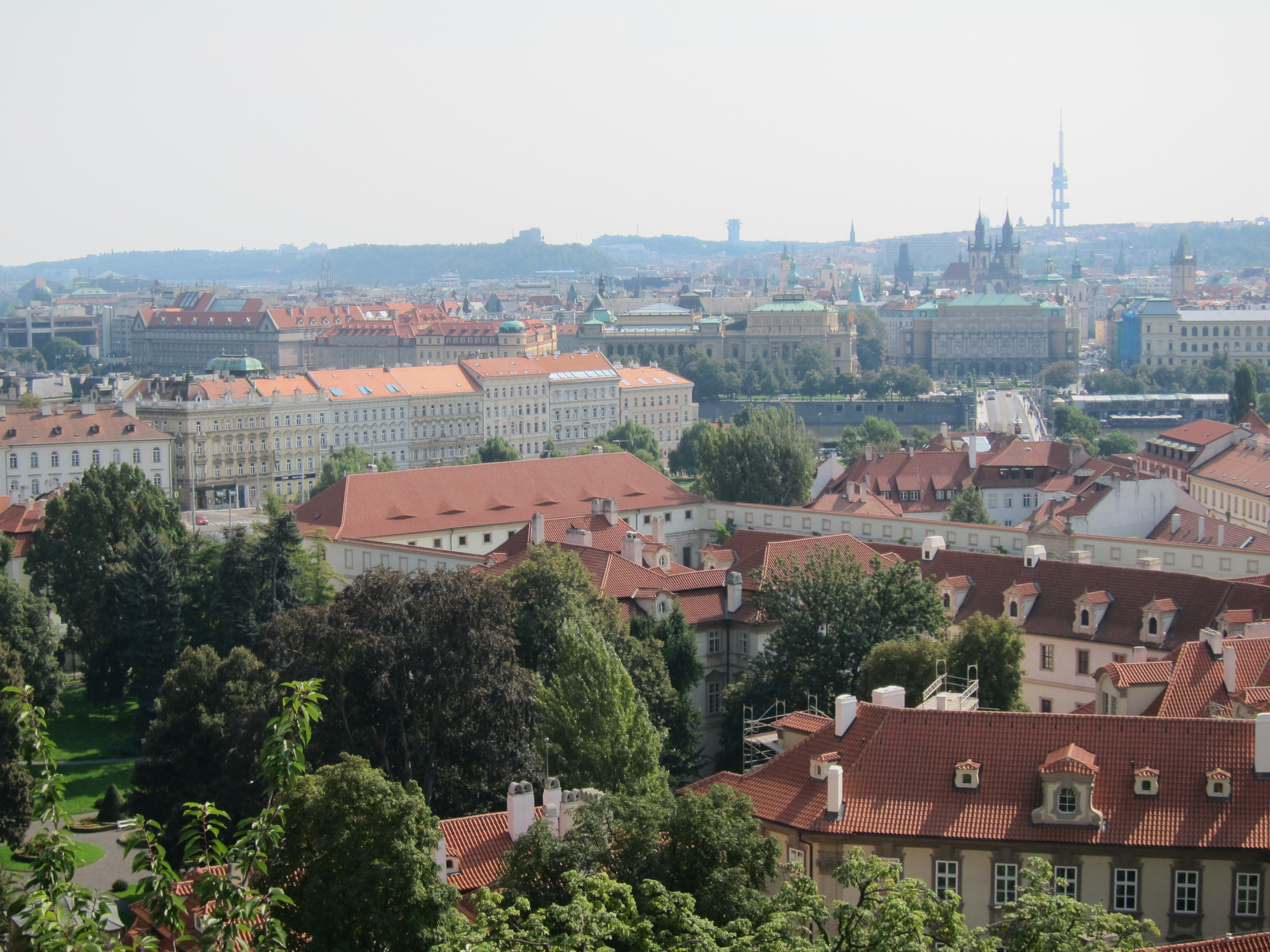 And here’s the view from the castle back toward the Old Town. On the right you can see the spires of the Church of Our Lady before Tyn. Just to the right of that off in the distance is the Zizkov Television Tower: