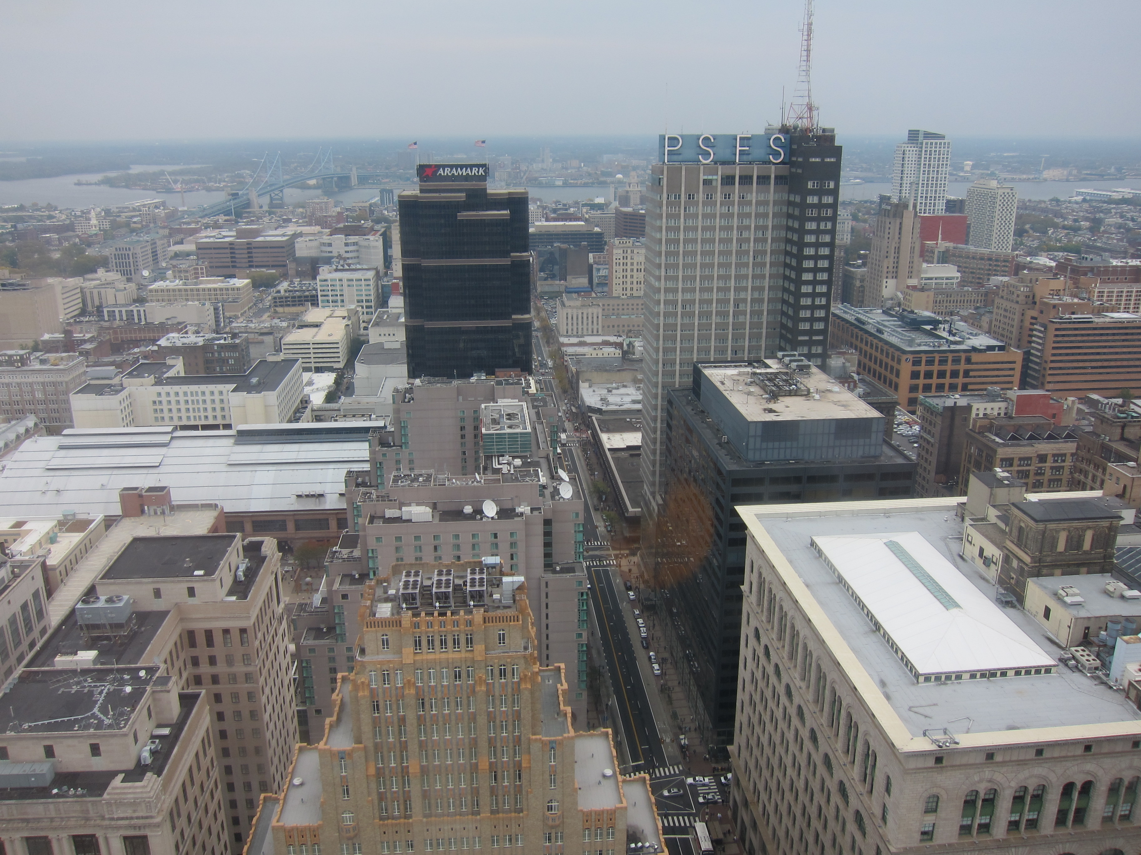 Looking back west you can see the most notable of Philadelphia’s skyscrapers and the city’s four tallest buildings. From left to right are the 58 floor Two Liberty Place, the 61 floor One Liberty Place, the 54 floor BNY Mellon Center and the city’s tallest building, the Comcast Center: