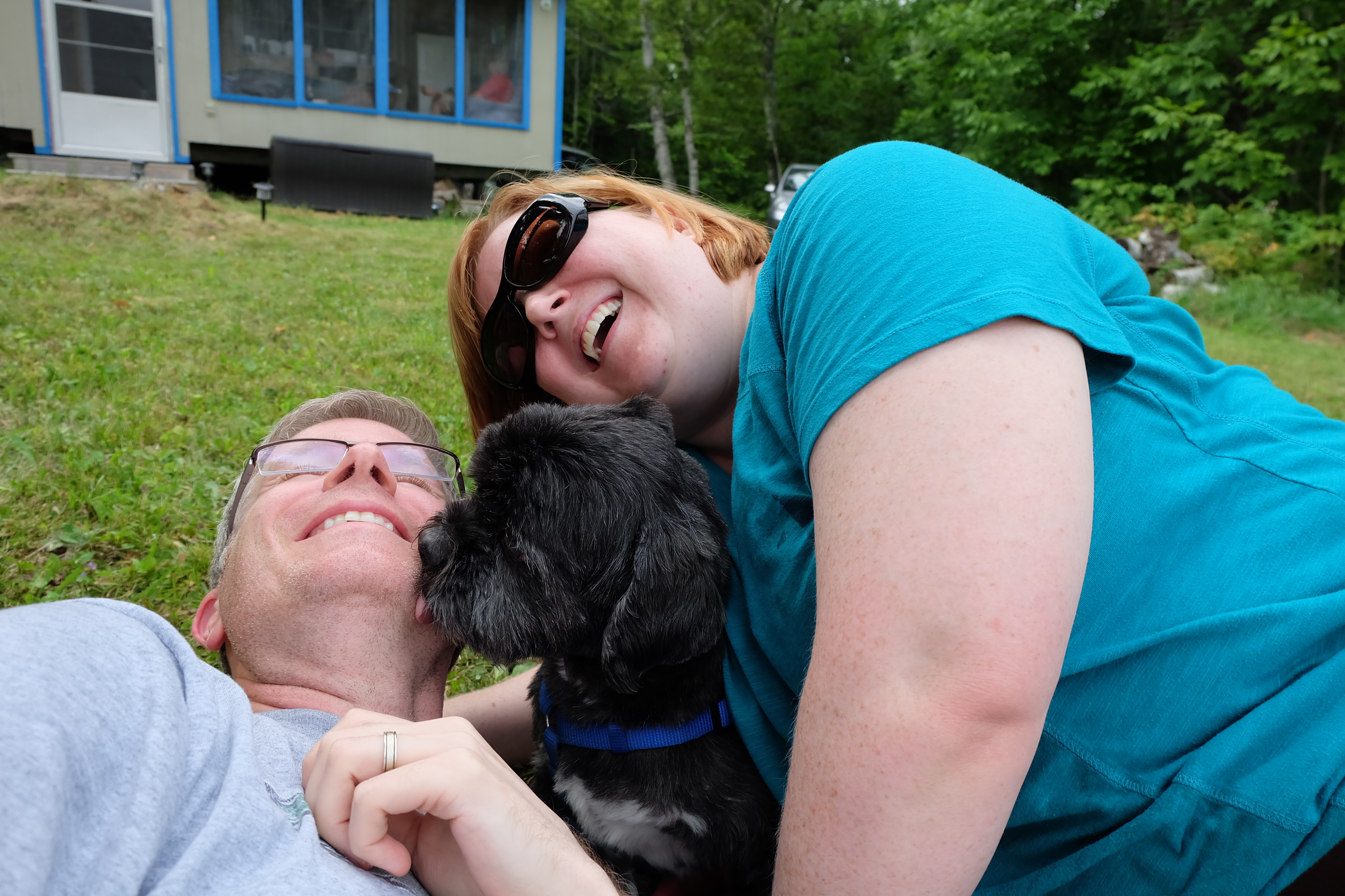 We’ve come to realize he’s a happy and easy going dog, especially when he’s got both of us nearby.  After a day to get used to his new surroundings, he was getting pretty comfortable at the cottage.  We tried to take a picture of the three of us, but his friendliness changed the composition of the picture: