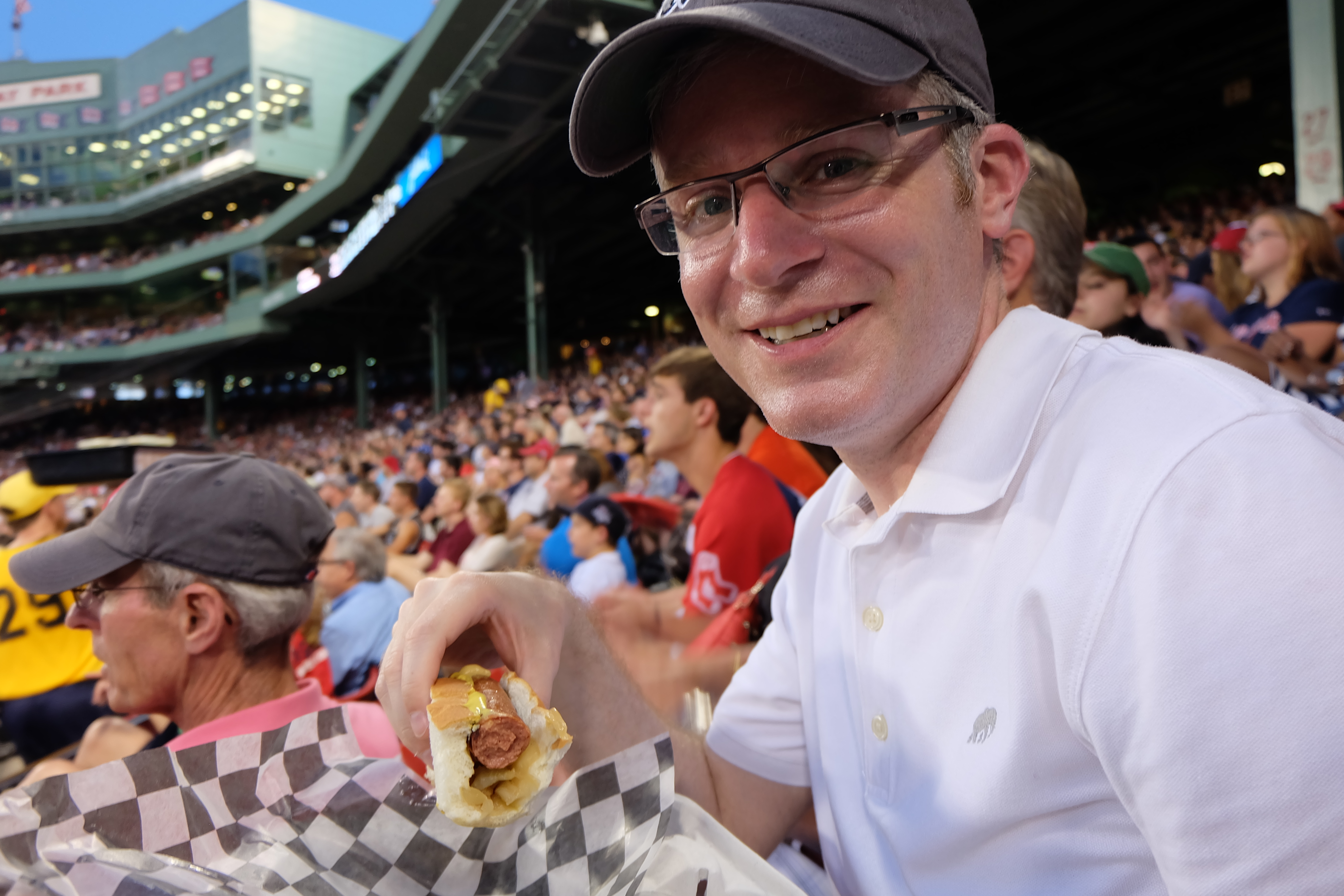 With neither team putting up much offence, the game moved along quickly. So quickly, that I didn’t get my traditional beer and hotdog until the third inning. I didn’t find the food choices too inspiring at Fenway so I went with a time-honoured Fenway Frank and a Narragansett Lager (the original beer served at Fenway). There’s something about sitting outside on a nice summer evening watching baseball and having a dog and a beer: