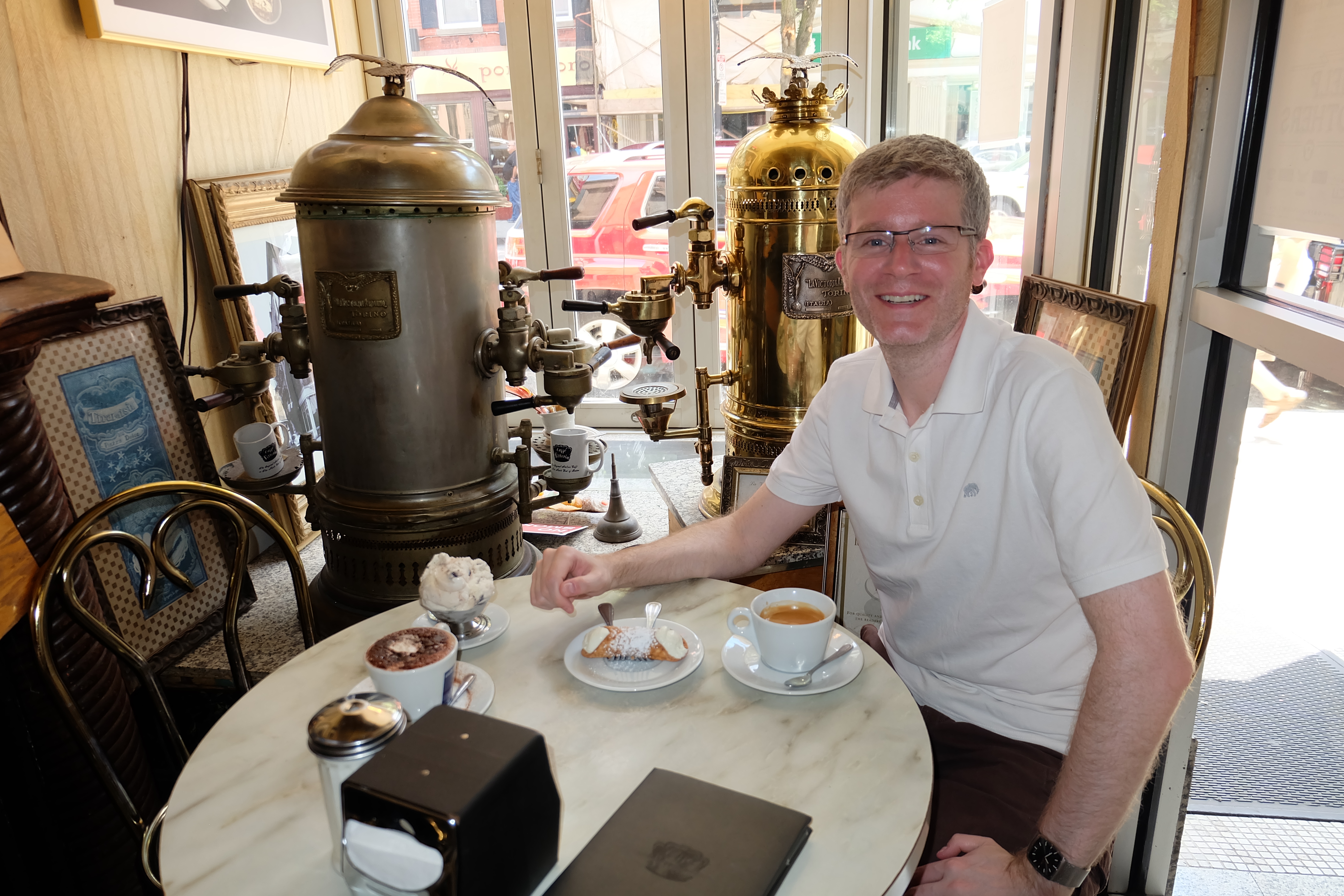 On the day we were exploring here, it was coming up on lunch time and I was woefully short on coffee in my bloodstream.  Lucky for me, Caffe Vittoria was only a couple of blocks away.  It is Boston’s first traditional Italian cafe, and now that I’ve just returned from Italy, I can vouch for how authentic this place is.  I opted for an espresso and a cannoli and a seat by the display of old manual espresso machines: