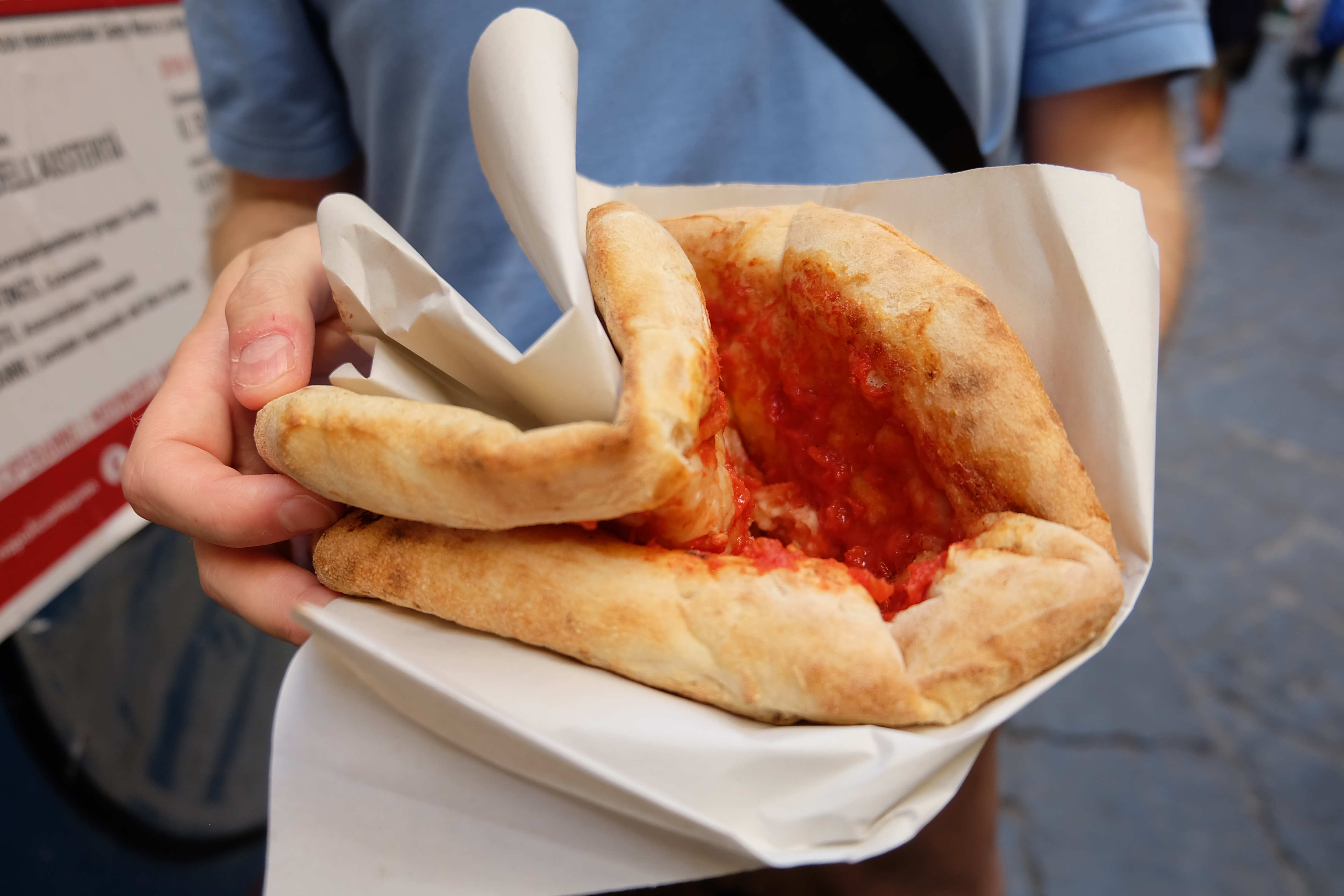 This was very good street food and perfect for a quick bite as we made our way to the archeological museum. Here’s a closer look at the pizza, folded for easy take away eating. This is about as well as you can eat for €2.00.