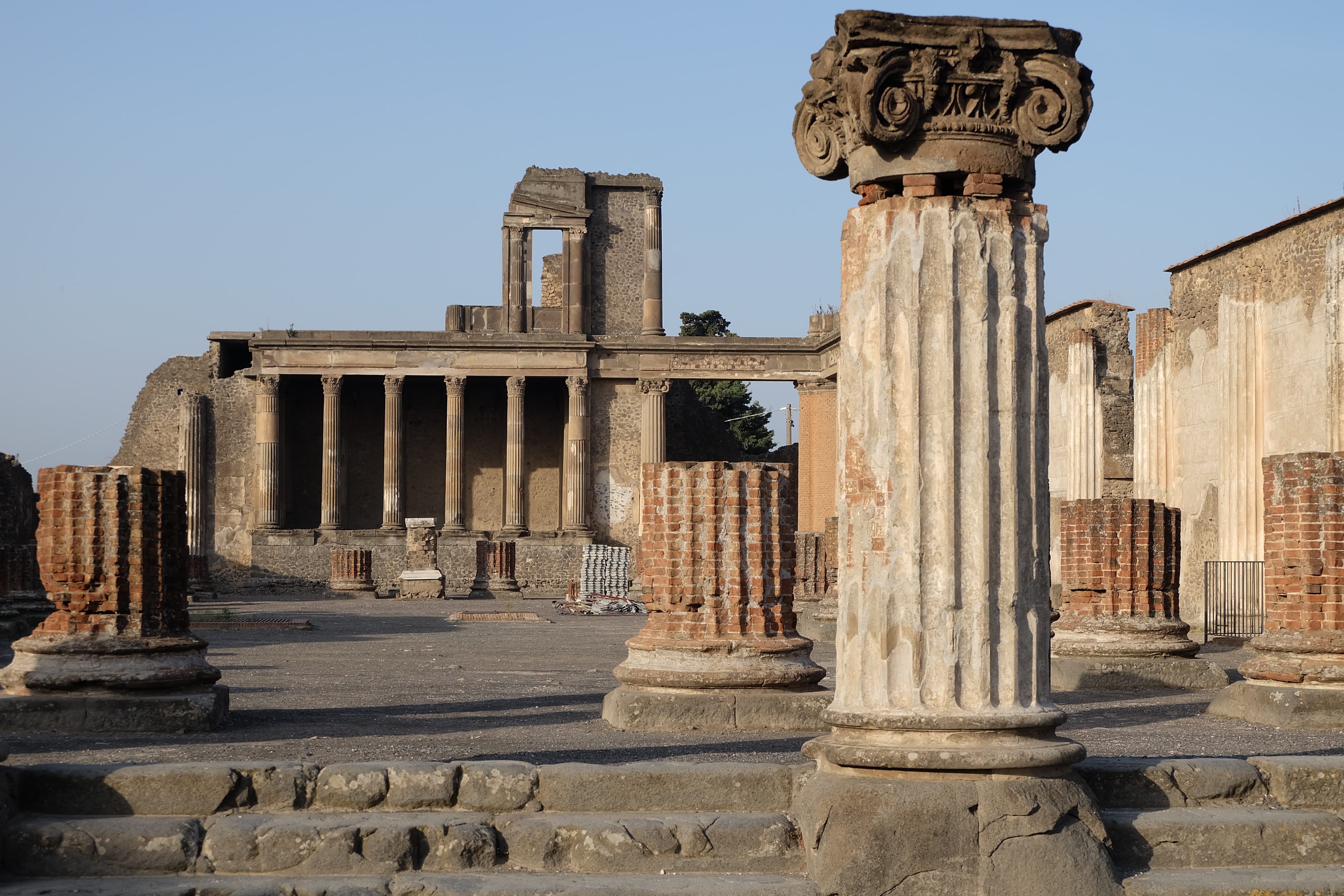 We started our tour right at the forum, and just off the southwest corner of it was the remains of the basilica which was used as a court of law. It is the oldest known basilica in the Roman world and dates to the end of the second century B.C. You can see the unfinished columns from the time of the eruption. Interestingly, the ones with bricks were a “new technology” and were to be coated with stucco to simulate marble columns once they were completed.