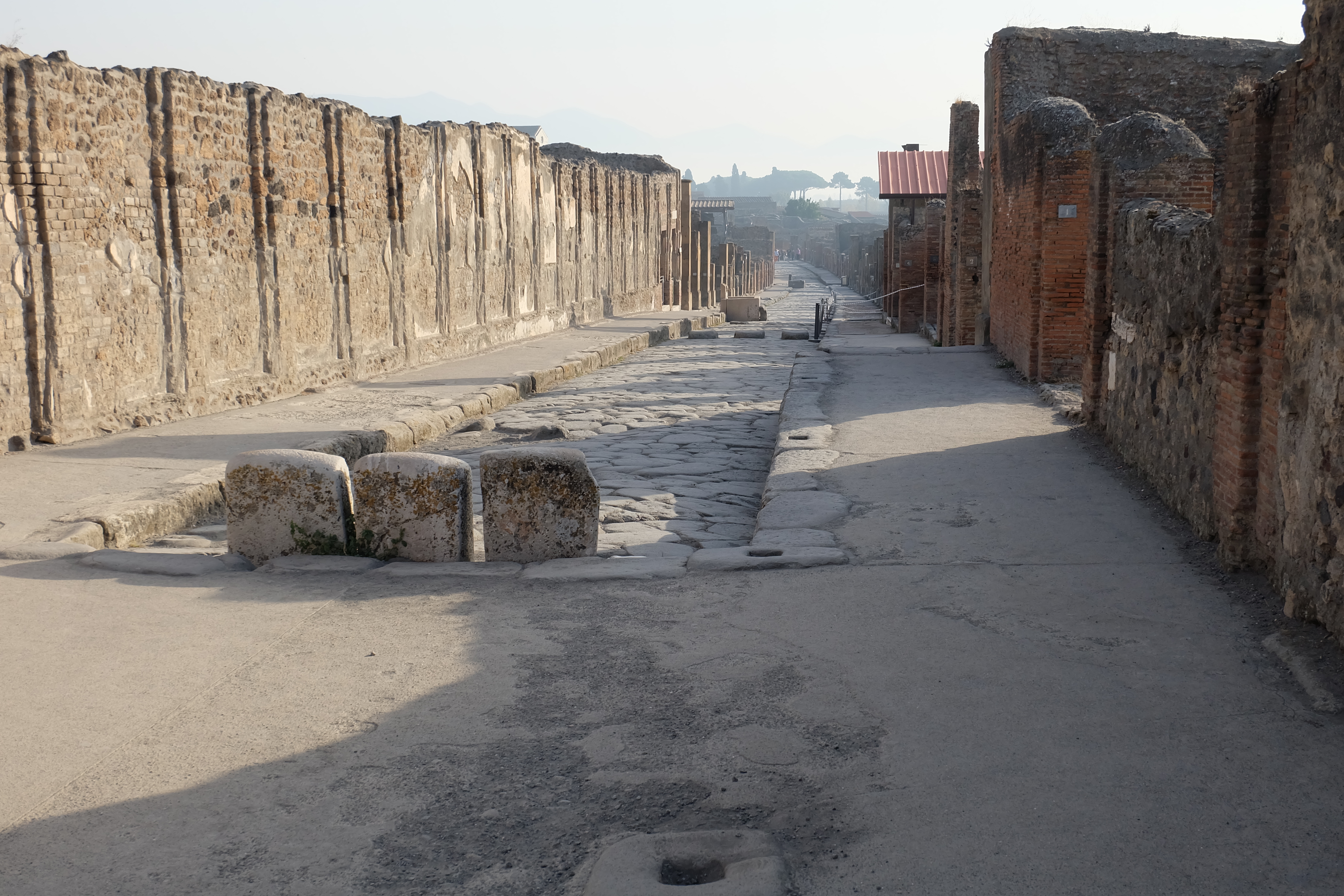 The streets in Pompeii gave an interesting glimpse back in time. They were used for drainage so they have raised stones that let people cross without getting their feet wet. If you look closely at the bottom of the photo below you can see the impressions left by the heavy chariots and how the stone crosswalks were designed to align with the wheel dimensions of the chariots in the town: