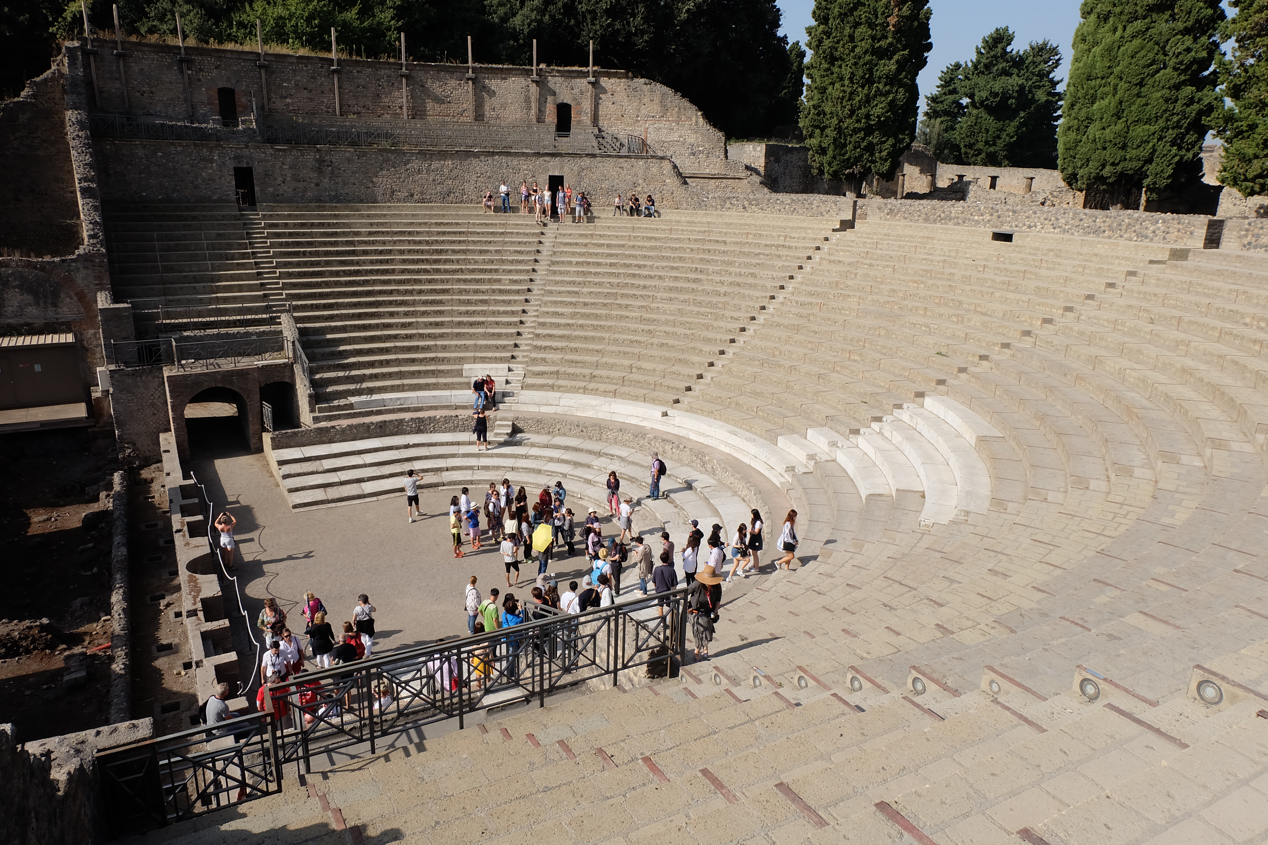 One of the more architecturally impressive areas at Pompeii is the large theatre. This accommodated up to 5,000 people for performances. You’ll see some marble seating in the lower area – those were the “expensive seats”. From where I was standing when I took this photo, this was the least expensive third tier of seating for the commoners and possibly the single worst seat in the entire place:
