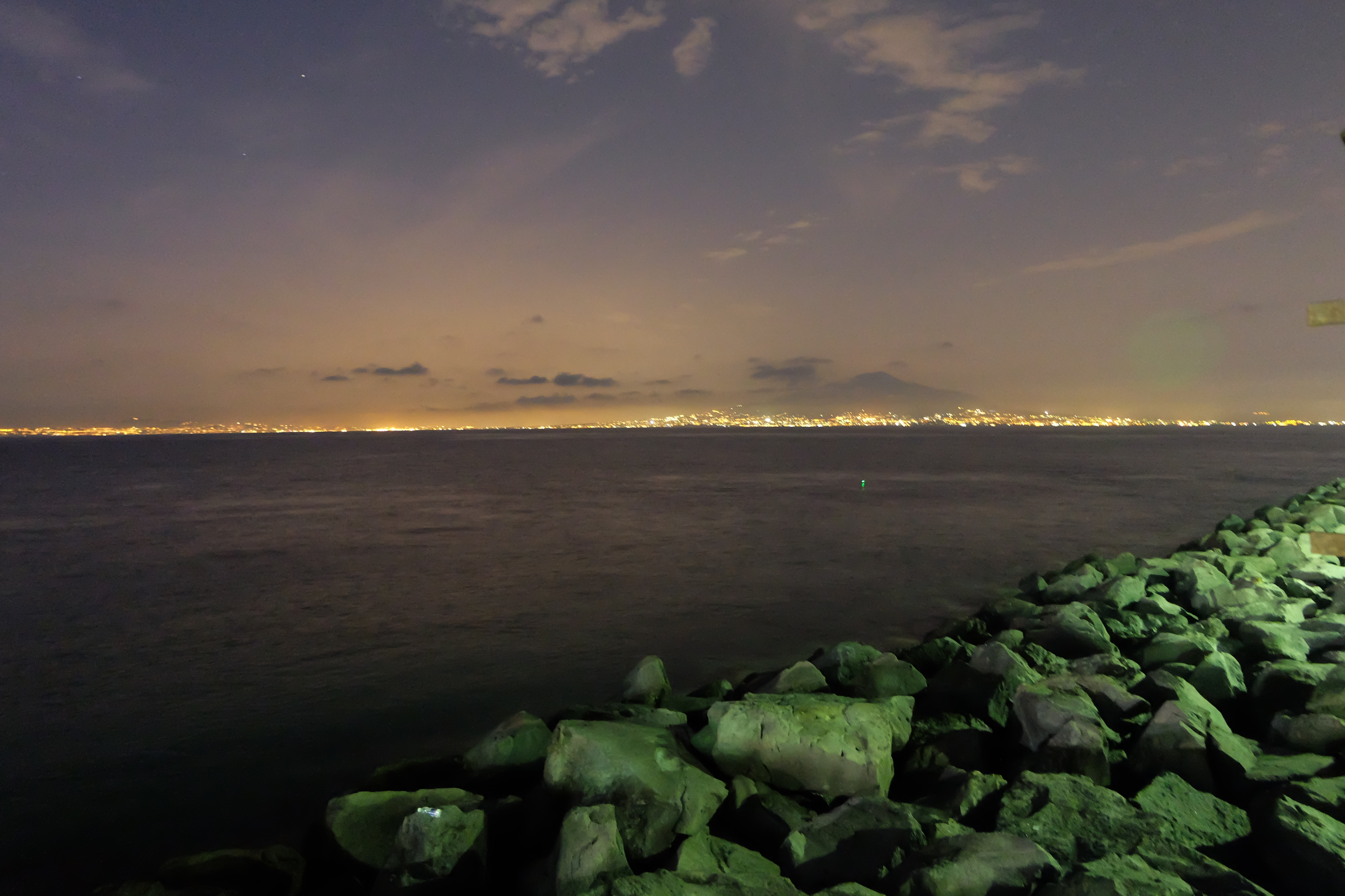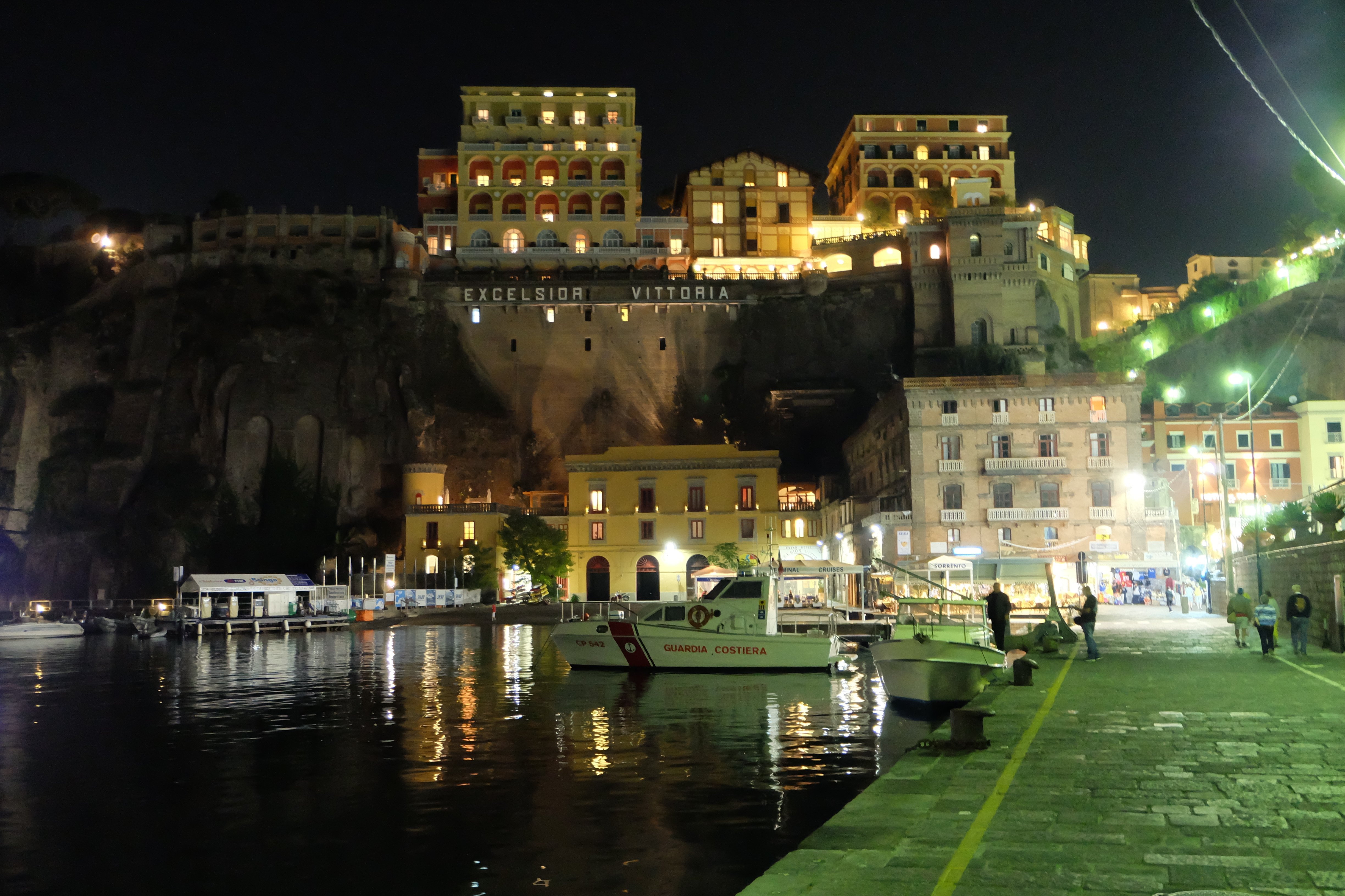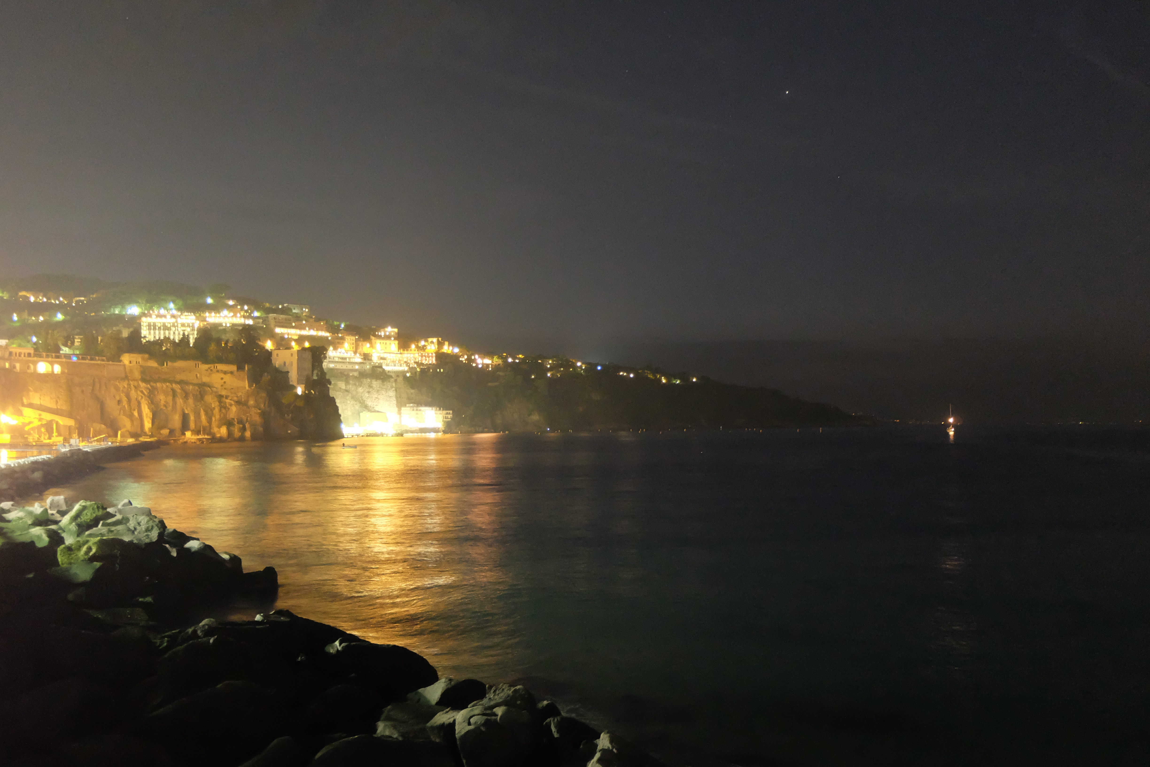 The waterfront provided some exceptionally beautiful sights at night. First, this is a look to the west and the cliffs of the Sorrentine Peninsula.