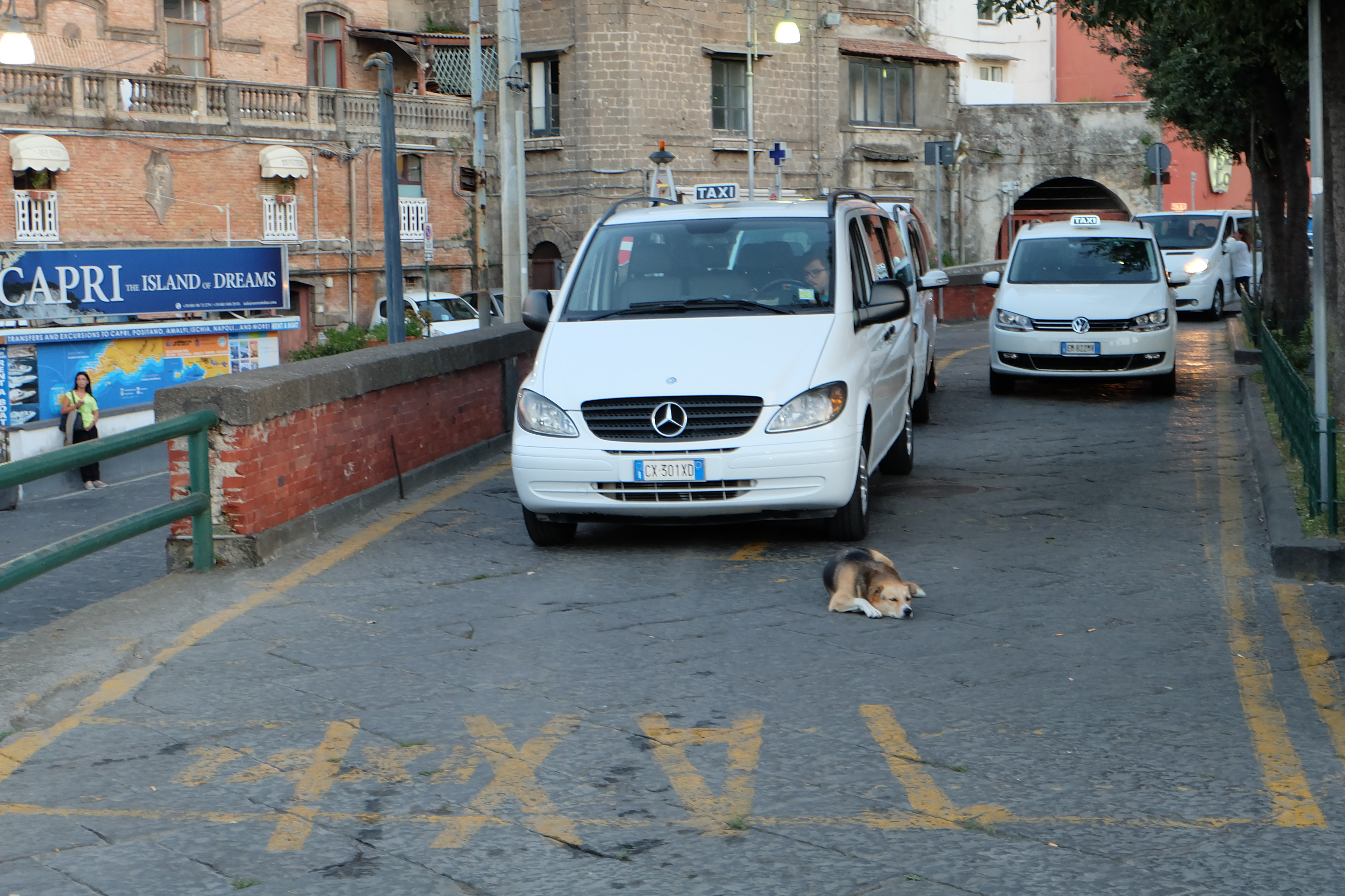 As our time in Sorrento was nearer the end of our trip, we were really starting to miss our dog back home. There were a number of stray dogs wandering around the town, but this guy captured our hearts. Whether down here near the ferry docks, or further in the town up above, we found him a few times over our five days taking a nap in front of a line of taxis.