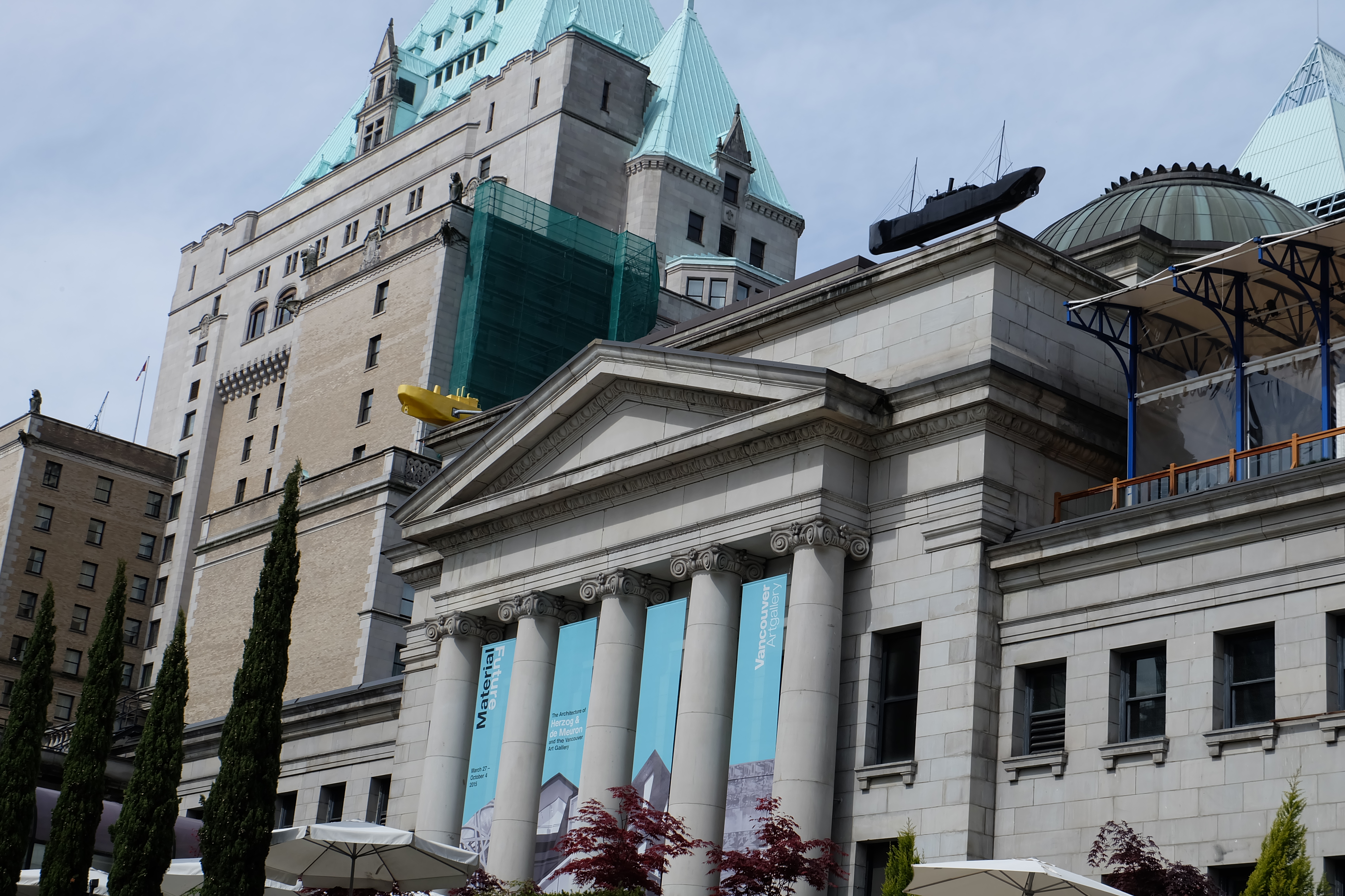 After the afternoon exploring Yaletown, I walked past this work on my way back to my hotel. On top of the Vancouver Art Gallery is a work entitled “Four Boats Stranded” by Ken Lum. The colours of the boats (and there are two others on the other side of the roof) represent colonial stereotyping of racial identity – the yellow boat is a stylized Fujian ghost ship, the black boat is the Komagata Maru. On the other side is a red First Nations longboat and the white representation of Captain Vancouver’s ship.