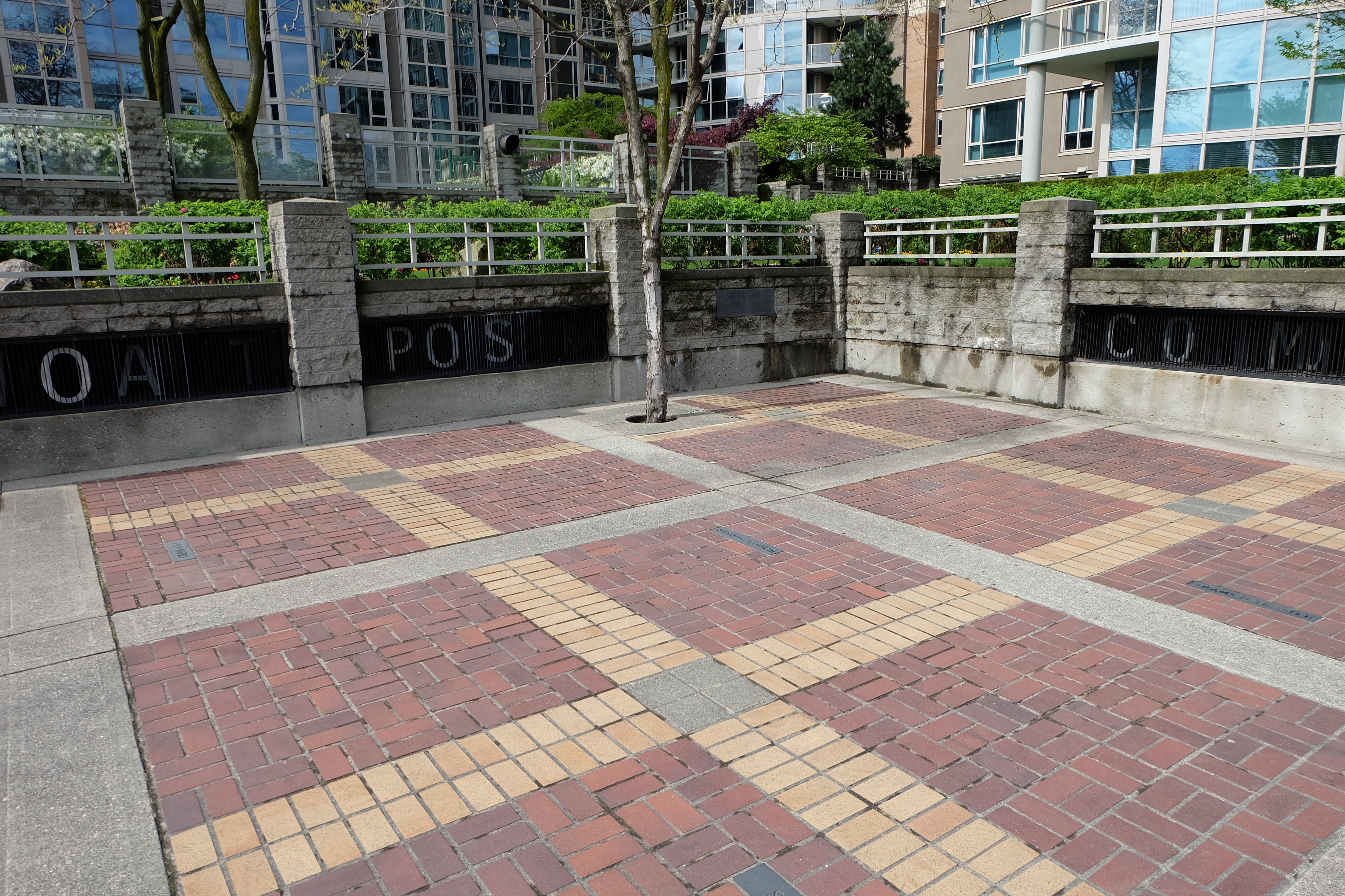 In the same area along Pacific Street is Alan Storey’s “Password”. There are four sets of four rotating letters that spin to form words from exhaust and air movement coming from an underground parking lot. The possible words are in groupings reflecting activities, architecture, space type and (of course since it’s in Canada) weather.