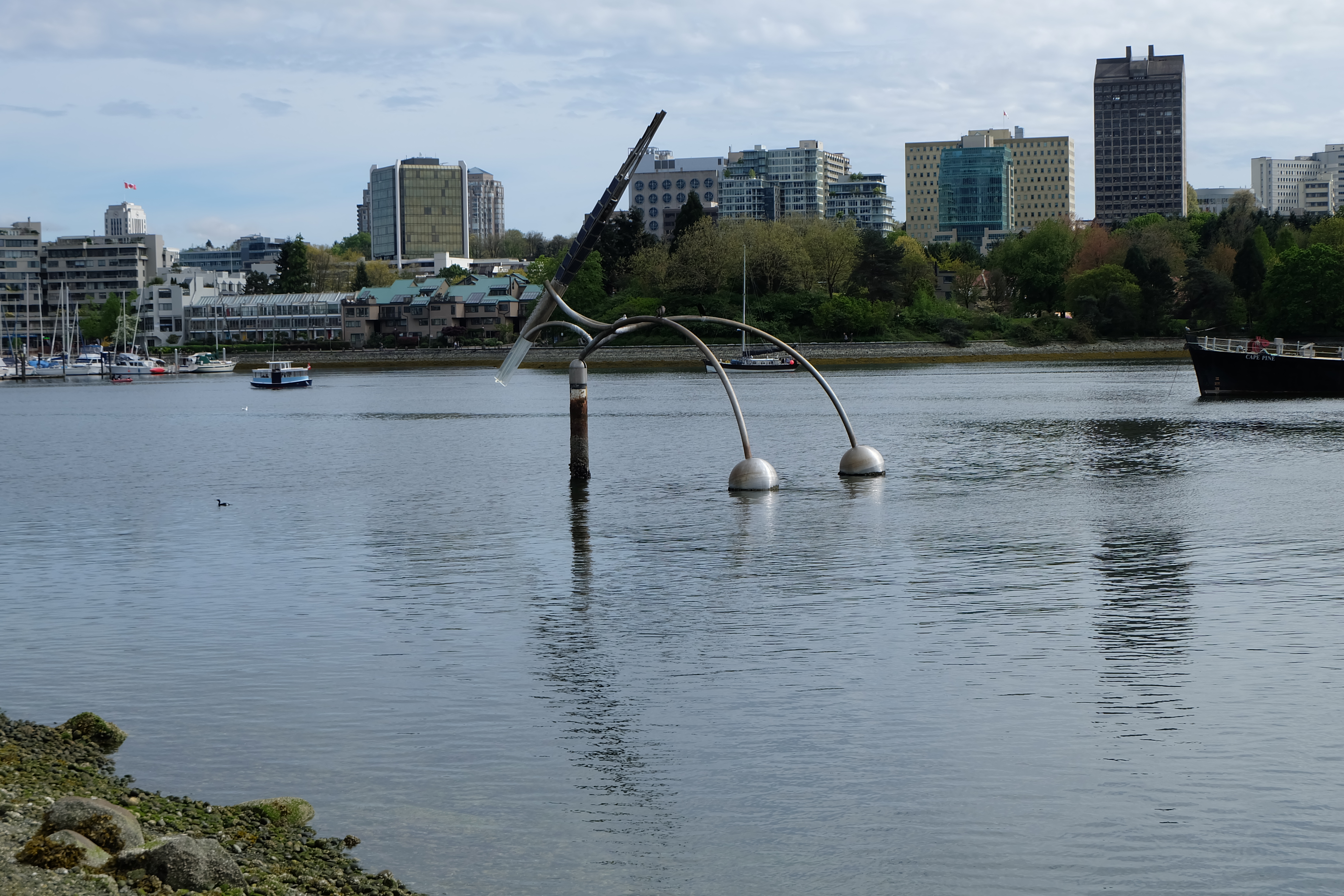 When I walked past “Brush with Illumination” by Buster Simpson, I have to admit it wasn’t really my cup of tea visually. However, after reading a bit more about the work, there’s more to it than meets the eye. This piece collects solar energy to power sensors that record environmental conditions here at False Creek. The brush part of the sculpture has an illuminated end that at night flashes per the ASCII codes of the data it collects.