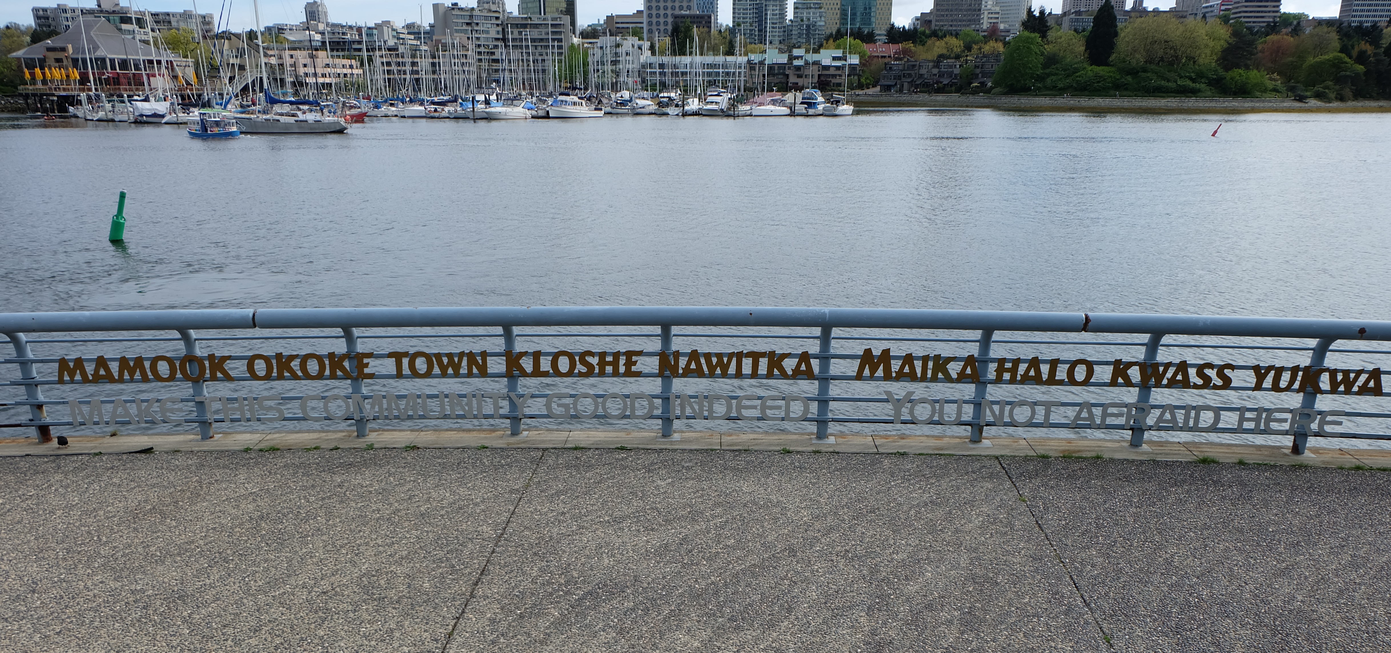 Another example of subtle art (and something I didn’t catch on my first walk past) was “Welcome to the Land of Light” by Henry Tsang. This mixes English and Chinook jargon text along a stretch of the seawall railing at False Creek. At night this is illuminated with fibre optic cable below the text representing the ability (hope? dream?) of technology to bring diverse cultures closer together.