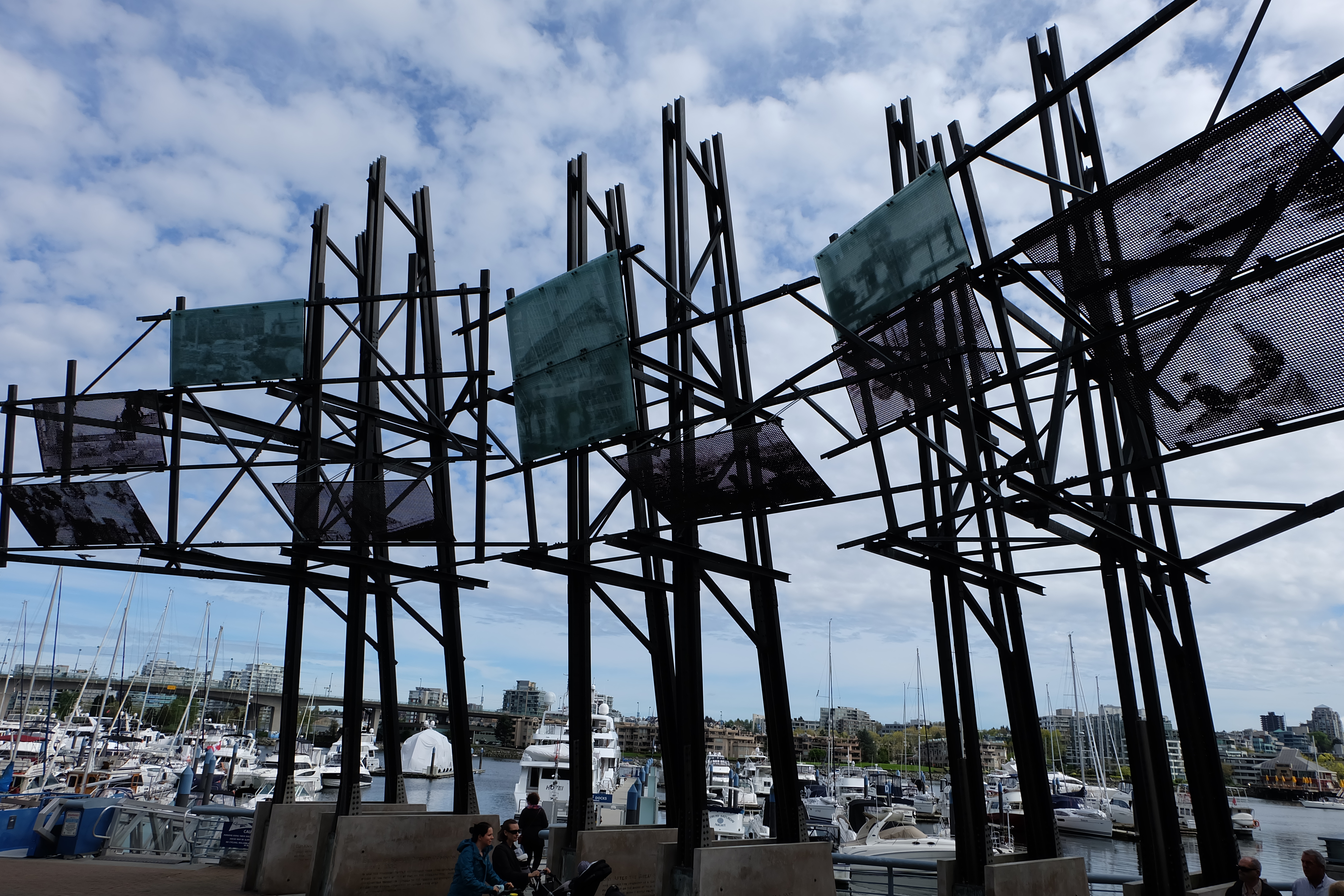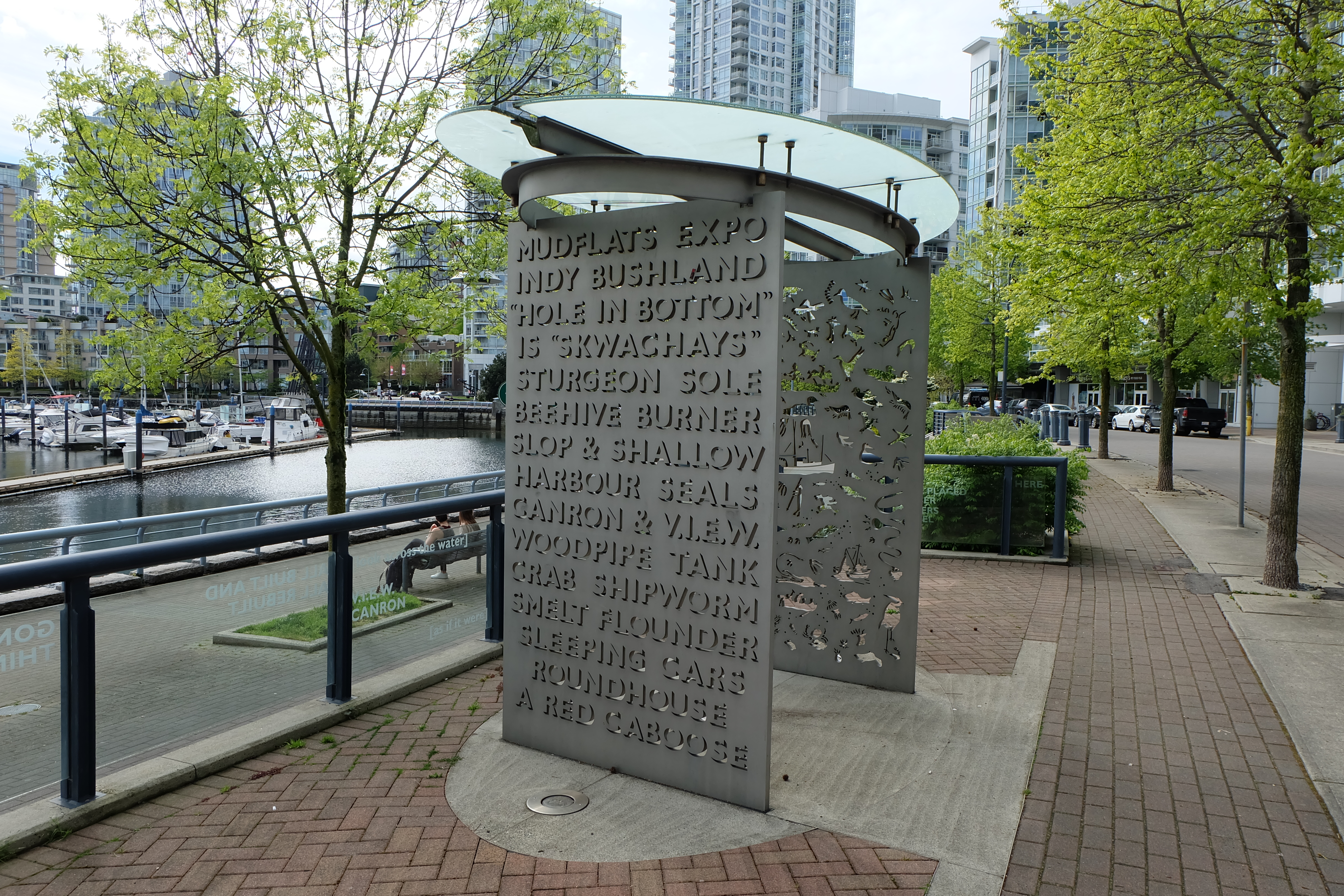 My tour of the Yaletown area kept turning up some interesting finds, and again, many were quite subtle. Along the street just above the seawall were two shelters inscribed with words and imagery. Entitled “Lookout” by artists Christos Dikeakos and Noel Best, this work is to provide shelter from the rain, a vantage point out to the water, and documentation of the history and present day of this place.