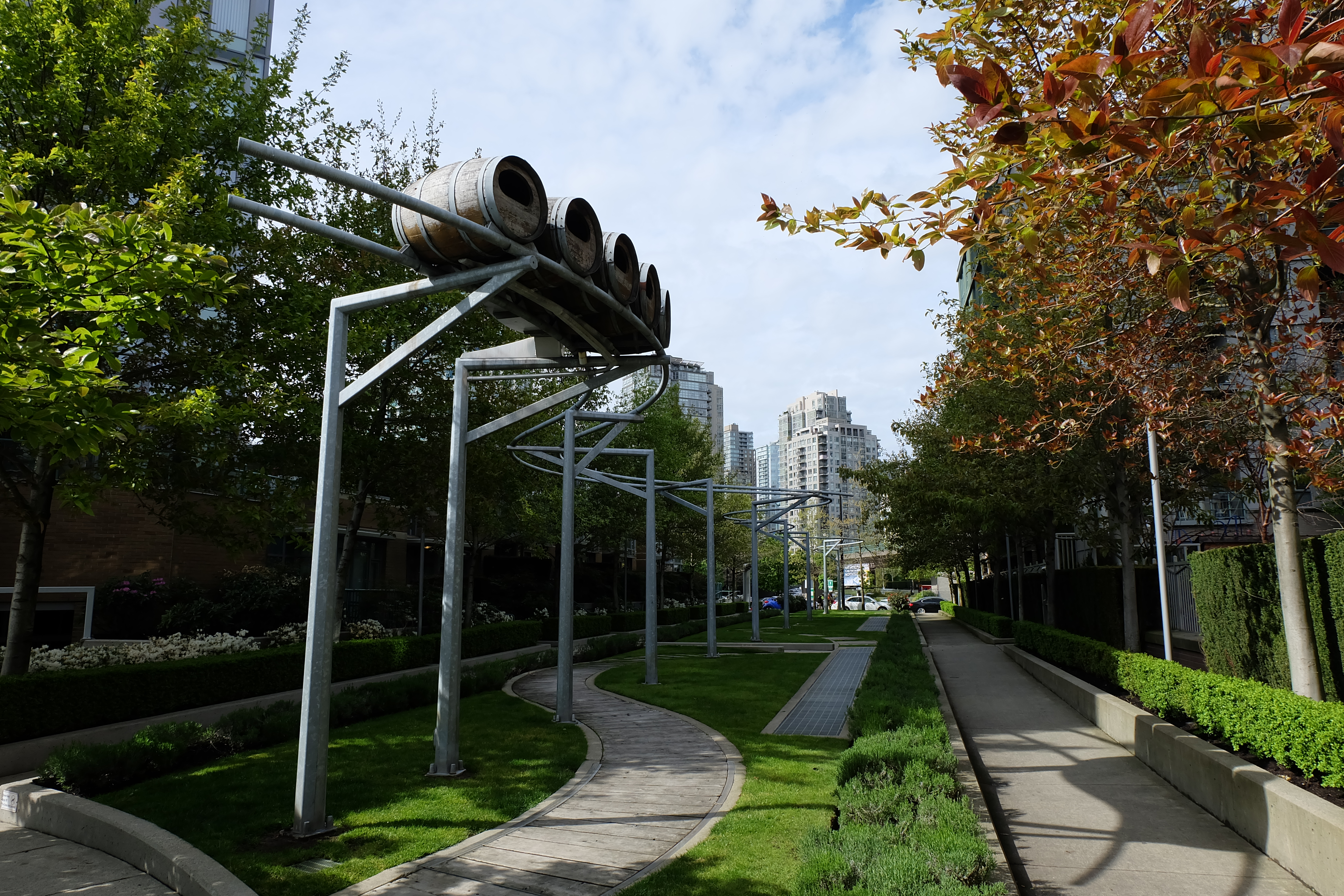 With a playful nod to the railway and brewing history of Yaletown and False Creek, “Coopers Mews” by Alan Storey is an interactive piece of art (unfortunately, not operational on my visit) between a couple of residential buildings. On the path under the tracks, there are boards that you can step on that emit sounds and steam from the barrels overhead.