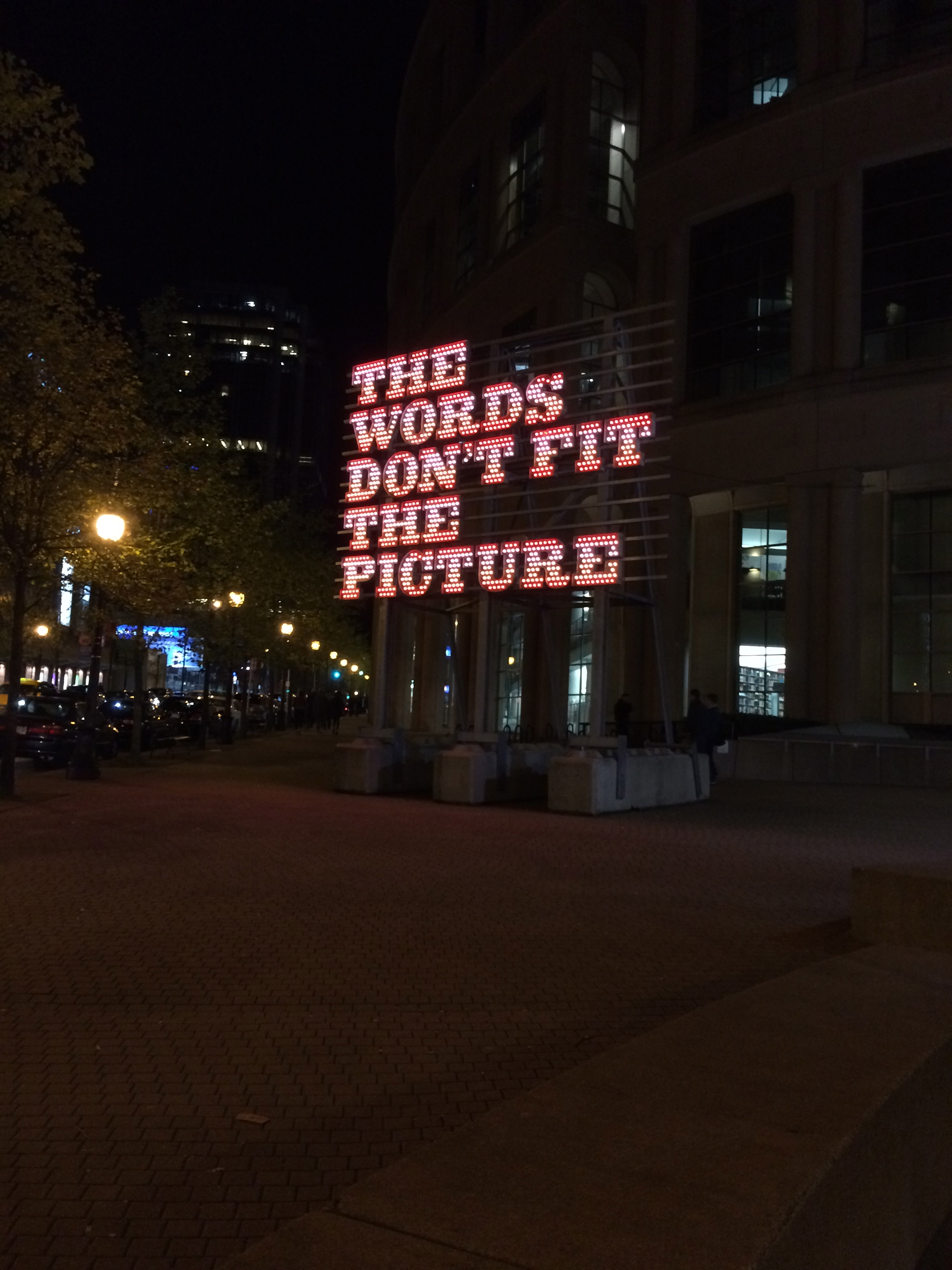 And finally, no exploration of Vancouver public art would be complete without walking past “The Words Don’t Fit the Picture” by Ron Terada. Located outside the city’s central library, I like how this art forms part of a boundary of the library. For me, it is a representation and reflection on imagination and the space between the literal and what is conjured in one’s mind. I saw this work as a strong metaphor for the building and what its books and texts can stimulate in all of us.