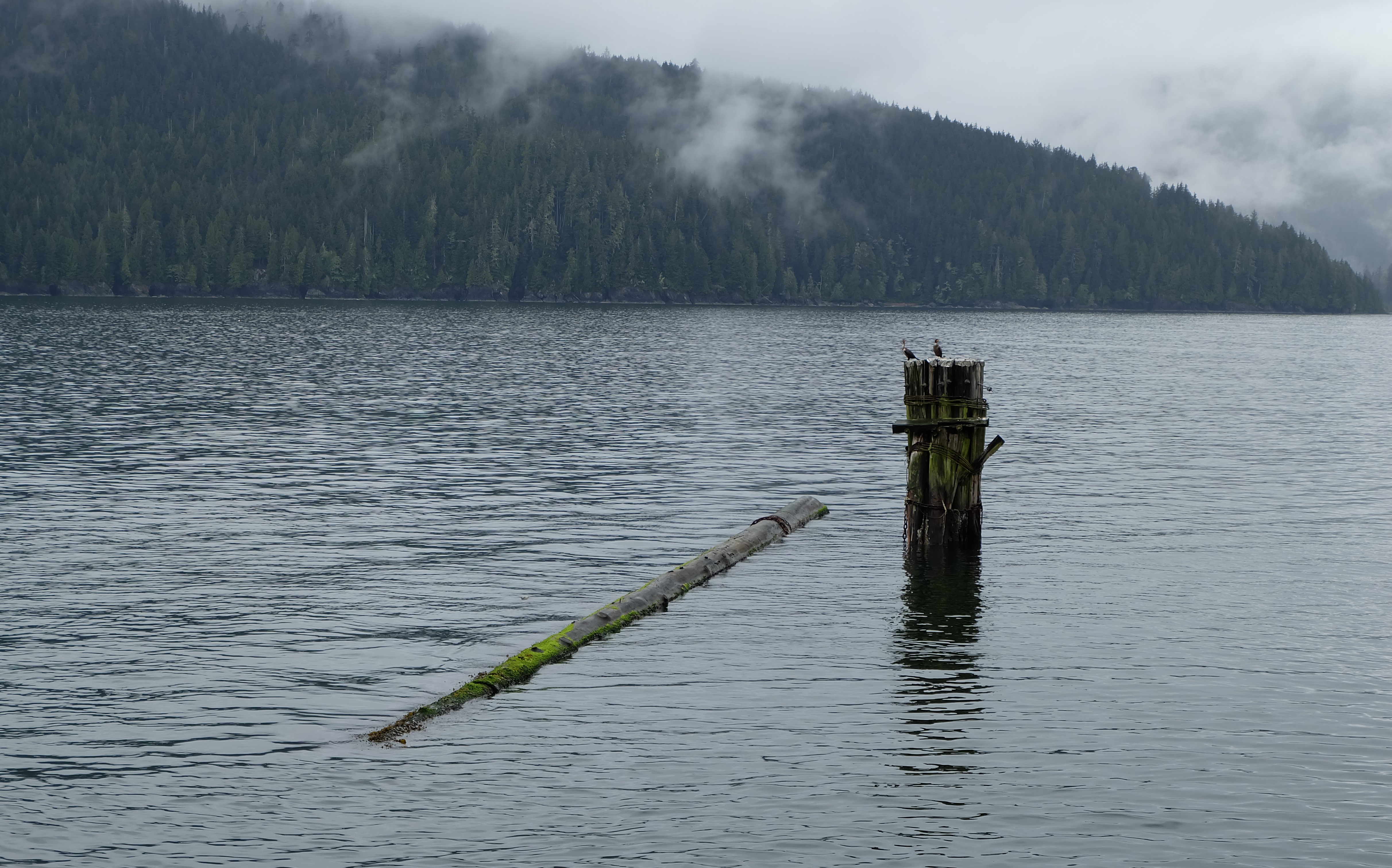 It was still raining pretty hard when I got to Port Renfrew. I pulled the car over for a quick granola bar snack and to check a map (I found the road signs in this area a bit confusing). The sound of the rain hitting the car roof slowed a bit as I drove up to Botanical Beach Provincial Park and the Juan de Fuca Trail trailhead. My plan was to do a short hike here, but the clouds were pretty socked in and there was no view to speak of, so I turned around and headed back toward the town, stopping near the government wharf in Port Renfrew. After walking by some cottages and a restaurant, I was at the end of the dock. Even if I didn’t know where I was, I think I may have guessed that I was standing somewhere on Canada’s west coast in April with what my eyes were seeing.