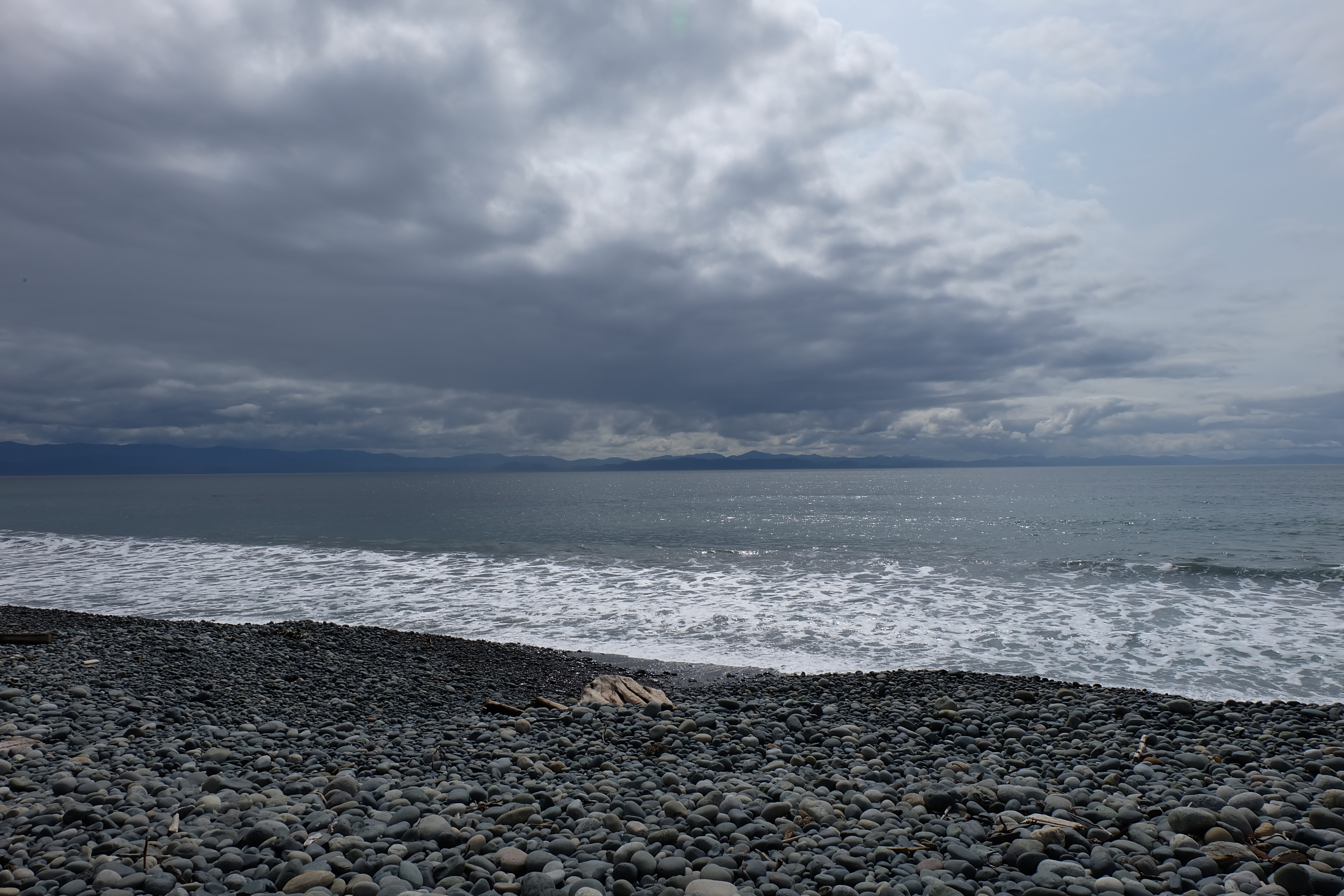 On the hike back uphill from the beach to the car, I felt like China Beach had just made my entire trip. One of the things I love about travel is how there is always a collection of experiences that expand your mind or give you some insight into yourself. I knew immediately in my mind that whenever I look back on this visit to the west coast, I’ll always remember sitting on the beach. After a parking lot change of clothes from hiking gear to restaurant-suitable attire, I pointed the car toward Sooke, intending to stop there for a coffee before my dinner plans. But another beach drew me in (not terribly surprising!). French Beach beckoned me to its rugged, rocky shore and even threw in some dramatic cloud cover to set the scene. It’s pretty easy to understand why people love living on the west coast.