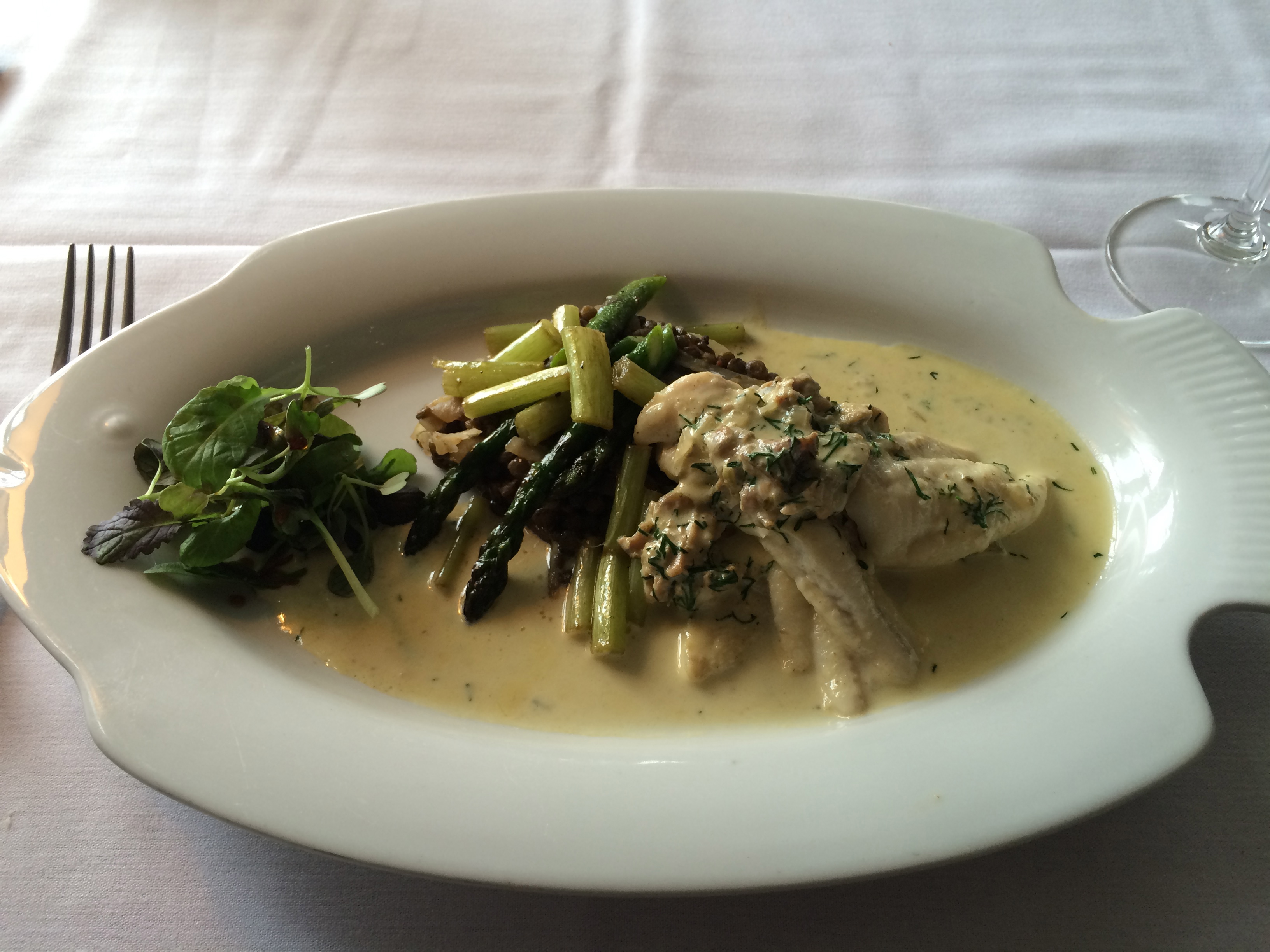 Given this might be a once in a lifetime visit, I decided to go with the four course tasting menu. I had purposely only had a small snack at lunch so I could sample as much as possible here. For a first course, I ordered the salad, unable to resist trying what was literally growing right outside the door. A mix of micro greens and flower blossoms was served with a chervil and spearmint vinaigrette and toasted sunflower seeds. As a great first course should be, this was a wonderful scene setter for the meal.