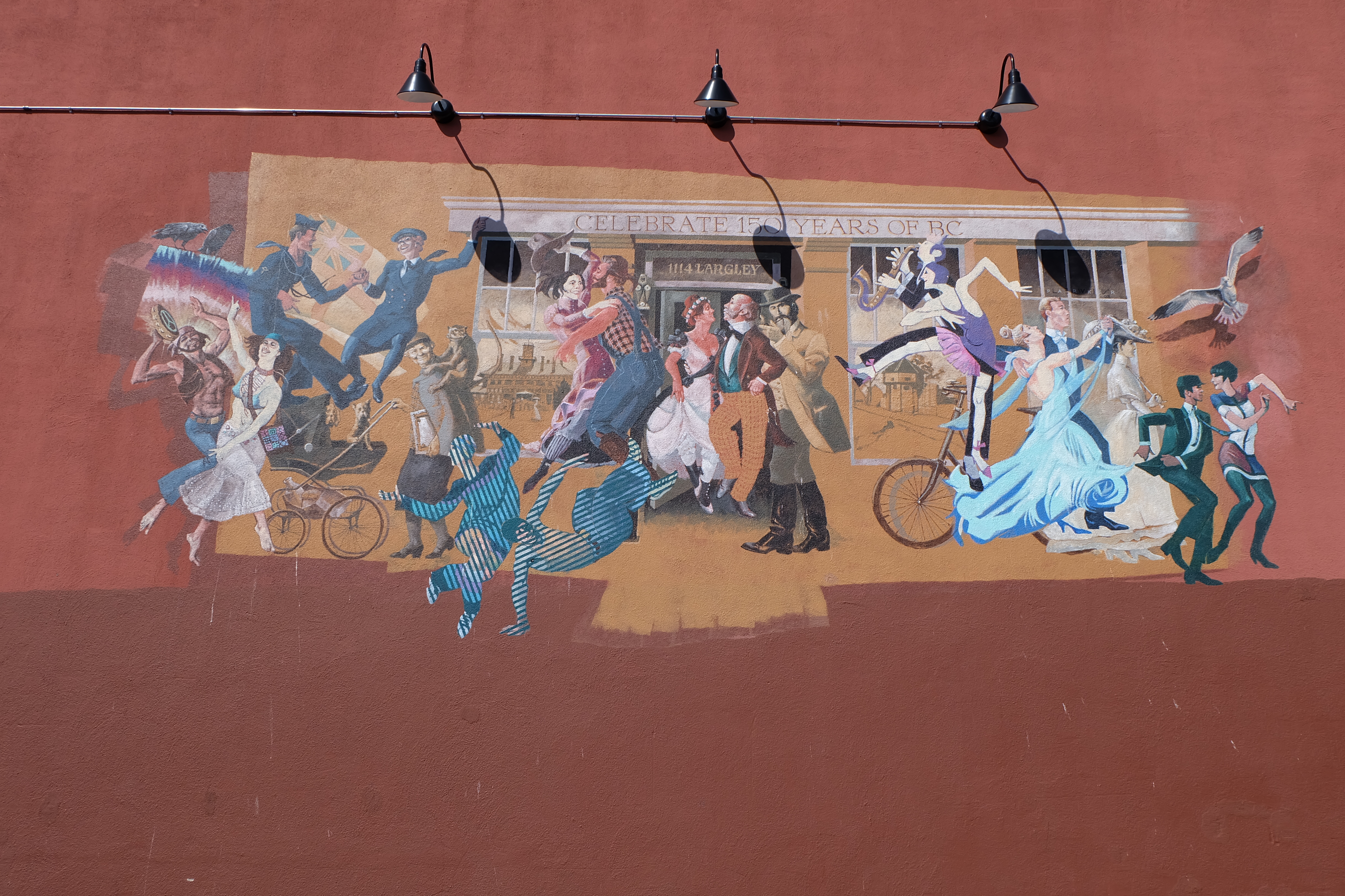 On the back of a building on Langley Street is this great mural, “Time Steps”, painted by Frank Lewis. It celebrates a 150 year timeline of British Columbia history in dance.