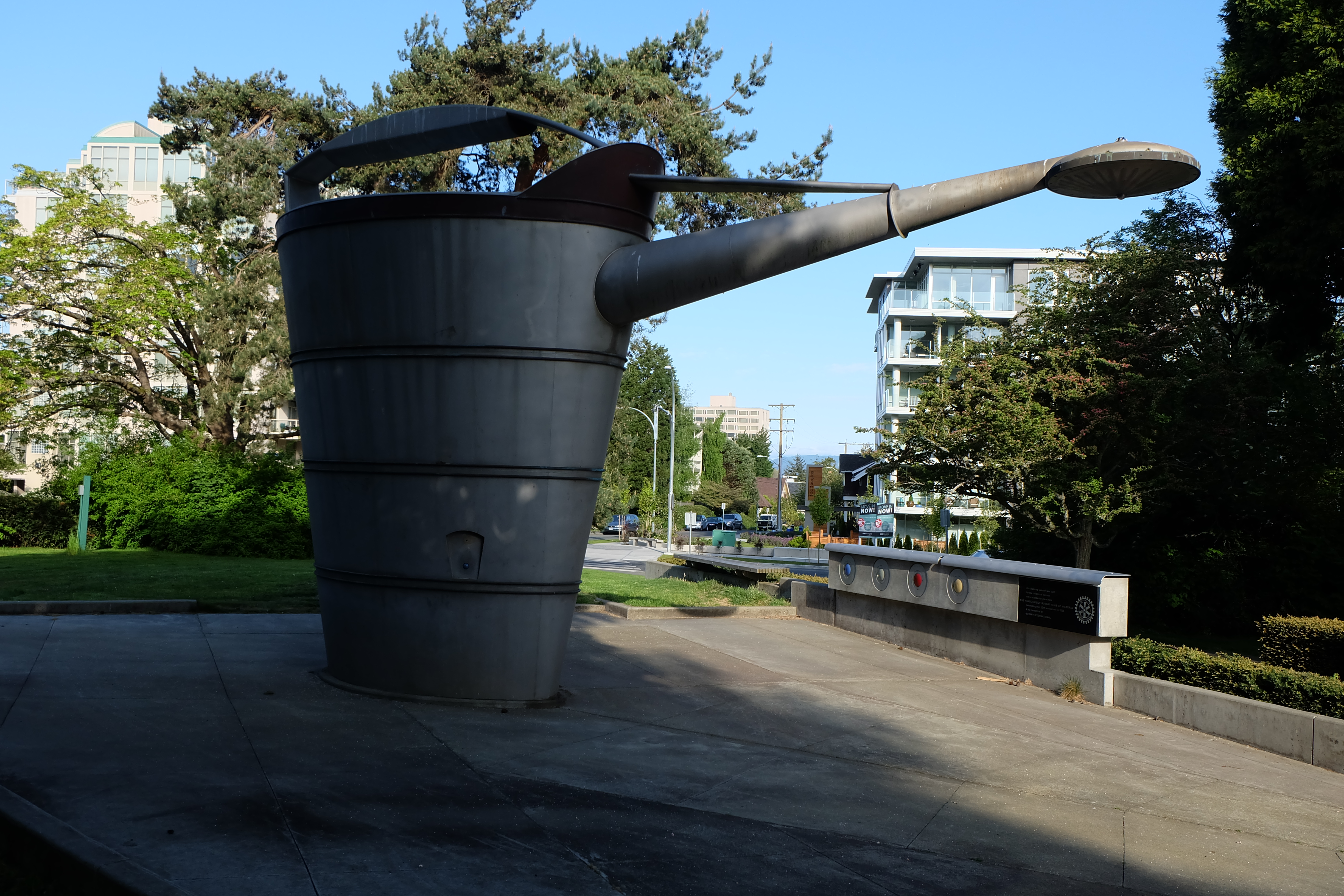 A very literal piece, “The Watering Garden” by Pechet and Robb Studio, reminds of Victoria’s love of gardening, something that is quite evident just inside Beacon Hill Park where this work resides. The watering can itself is seventeen feet high. There are buttons to push to make water come out of the spout and other locations around the can. This functions as a children’s water park that gets quite busy during the summer.