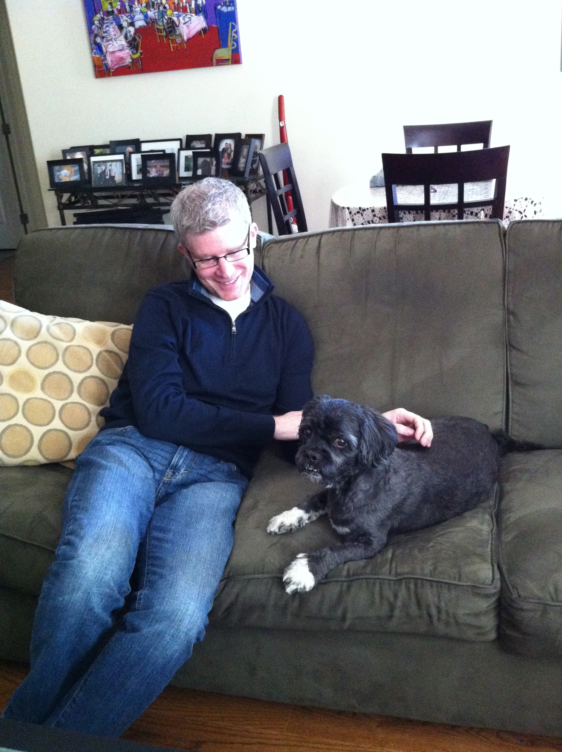 The first month was difficult. Chewy didn’t like being left alone and nothing we seemed to do would keep him from trying to tear apart our blinds, drapes and door frames. He re-injured his paws almost daily. But slowly, something started to click, and he understood we’d be back for him. We set up a webcam to study his destruction and plot our defensive moves. When he started scratching our front door, we put a tarp on it. One day, he scratched the tape off the tarp, and created a tent with it, then laid under his new tent for three hours. It was like he gave up trying to escape. He never scratched again. He was home.