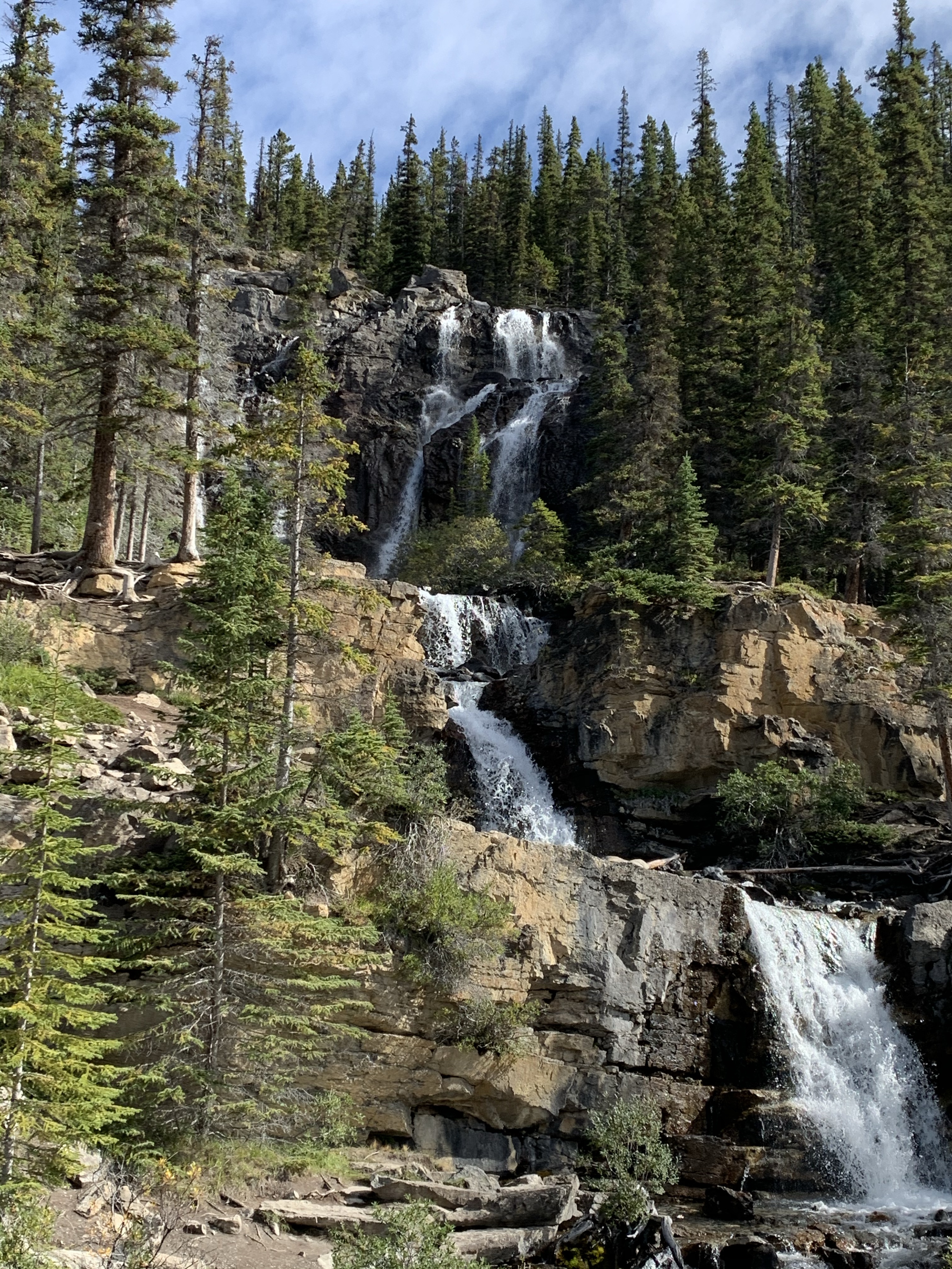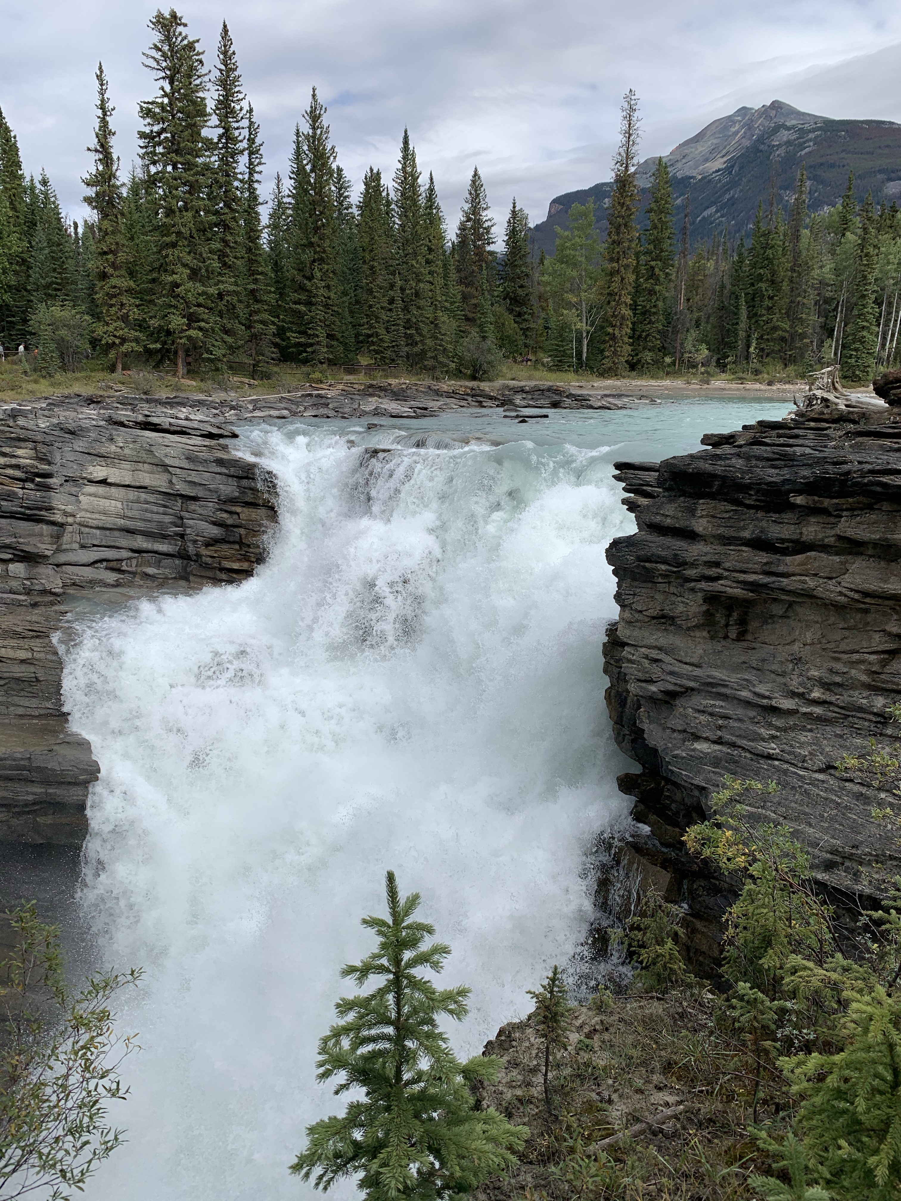 One of the highlights of a day of amazing stops was the time we spent at Athabasca Falls. About a five minute detour off of the Icefields Parkway, this was the only place we encountered any sort of crowd. It still felt like we had ample room to move around, even if the closer quarters meant we had to mask up while we stood at this prime spot above the falls where you could feel the power of the water’s 80 foot drop shaking the ground on which we stood.