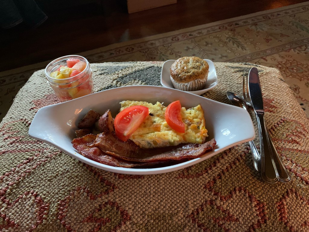 He was probably in search of some scraps of the delicious breakfasts that were dropped at our door each morning. Omelettes, pancakes, thick cut bacon, homemade muffins, fruit… each morning was a delicious surprise and we eagerly awaited the discrete knock at our door that signalled our breakfast had arrived.