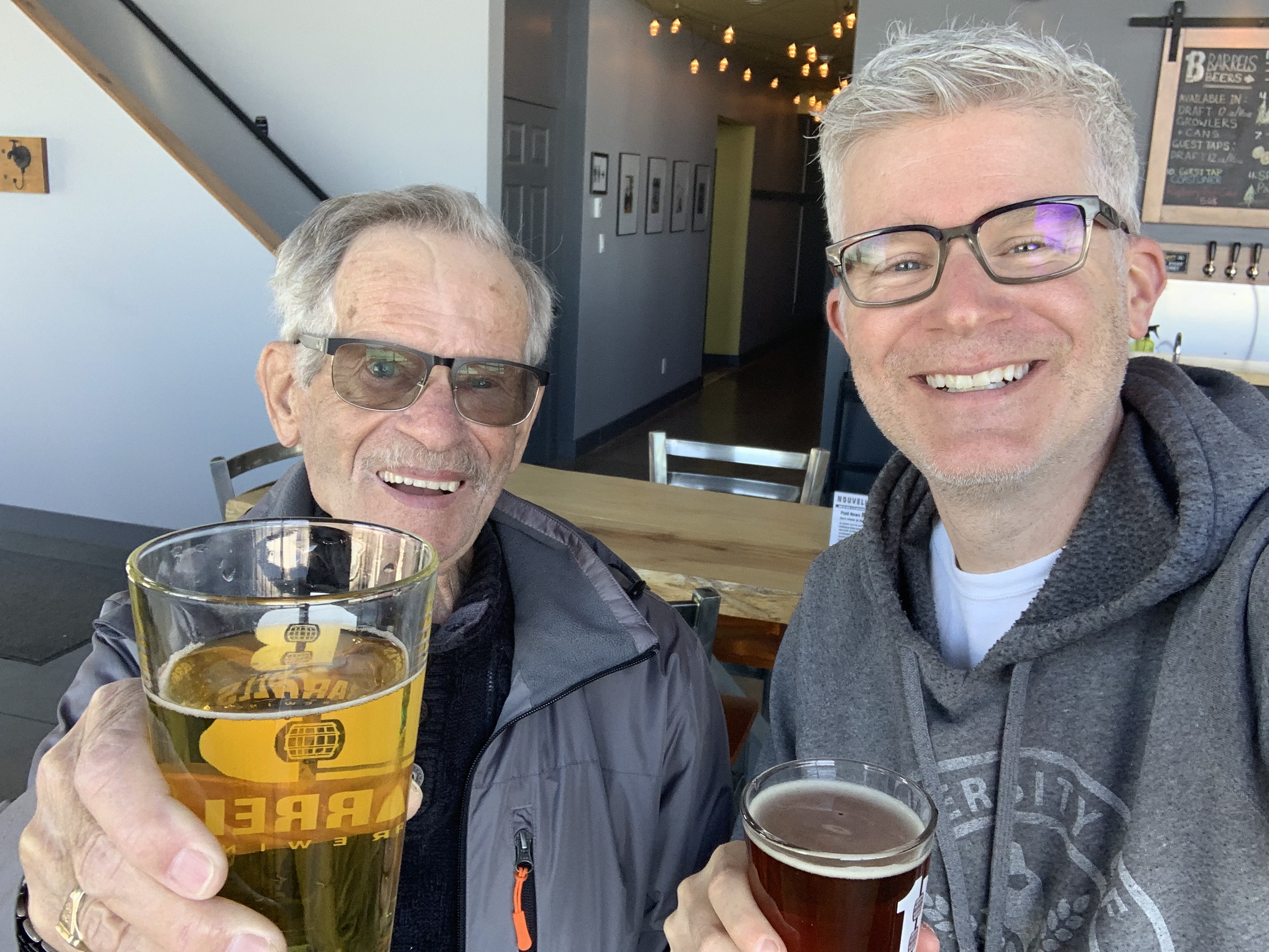 We followed that up with a short three block walk around the corner to visit my favourite craft brewery in northern New Brunswick, Four Rivers Brewing. You can tell by the photo we’re having a grand old time catching up.