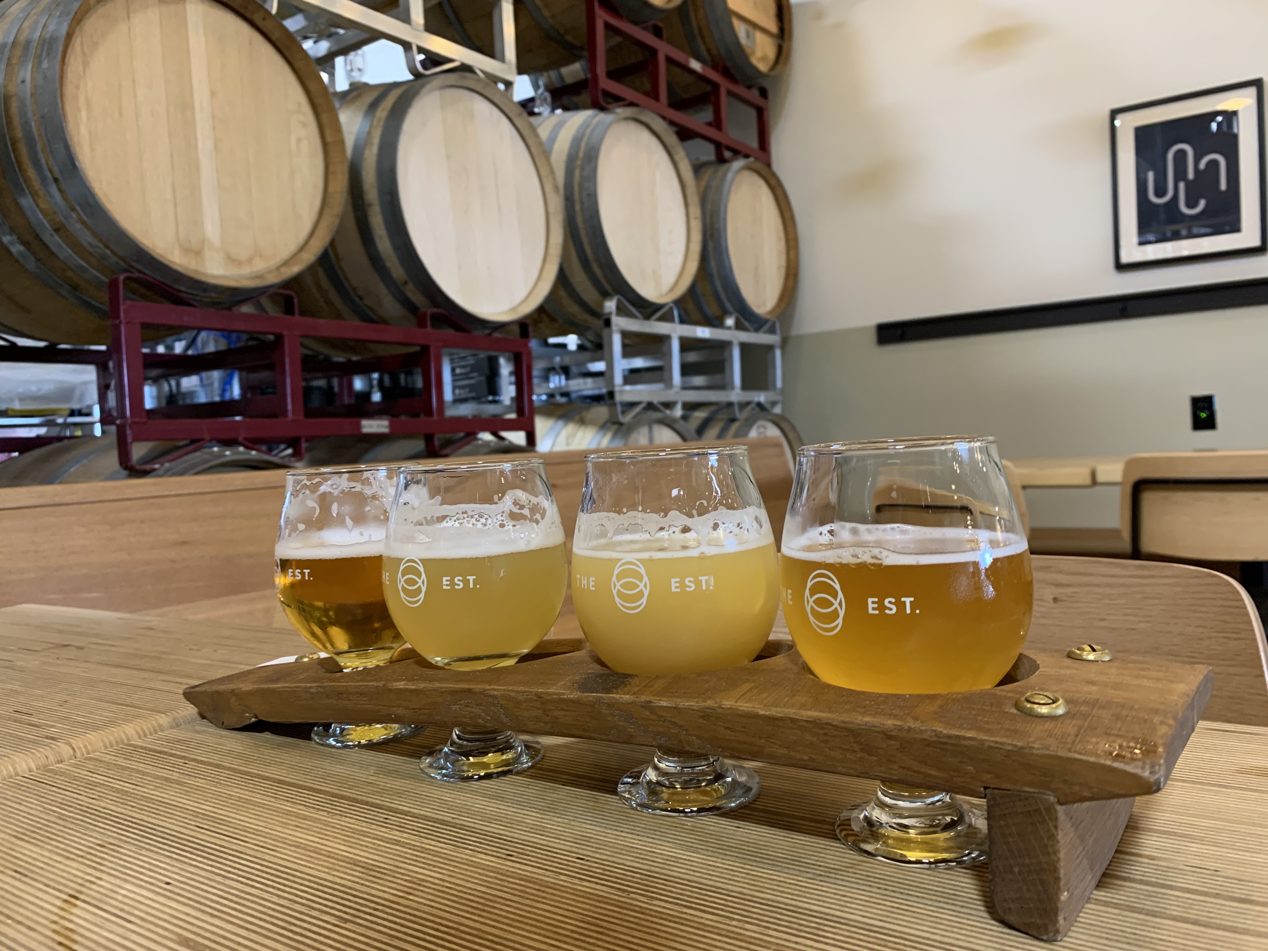 To wrap up my first day of tastings I next headed to Cabin Brewing. I loved the rustic motif of the taproom and loved the overall quality of the beers in this flight. My two favourites were the ones at the front of the picture below – the “Into the Dark” stout and the “Triples is Best”. That one, a triple NEIPA, is a style I hadn’t had before and one that I think I need some more of in my life. It was a 10% beer and it very dangerously went down a lot smoother than a 10% beer should.