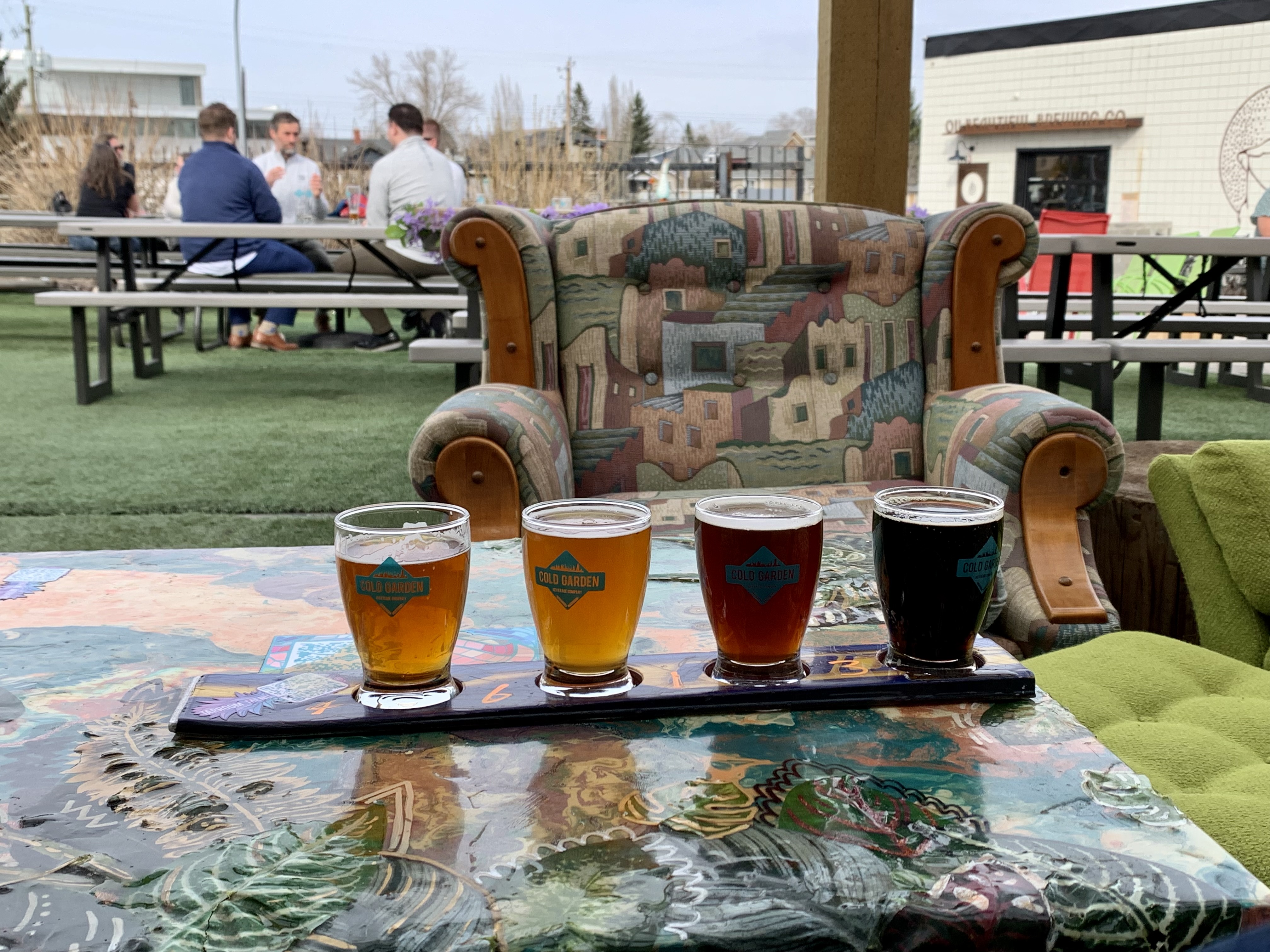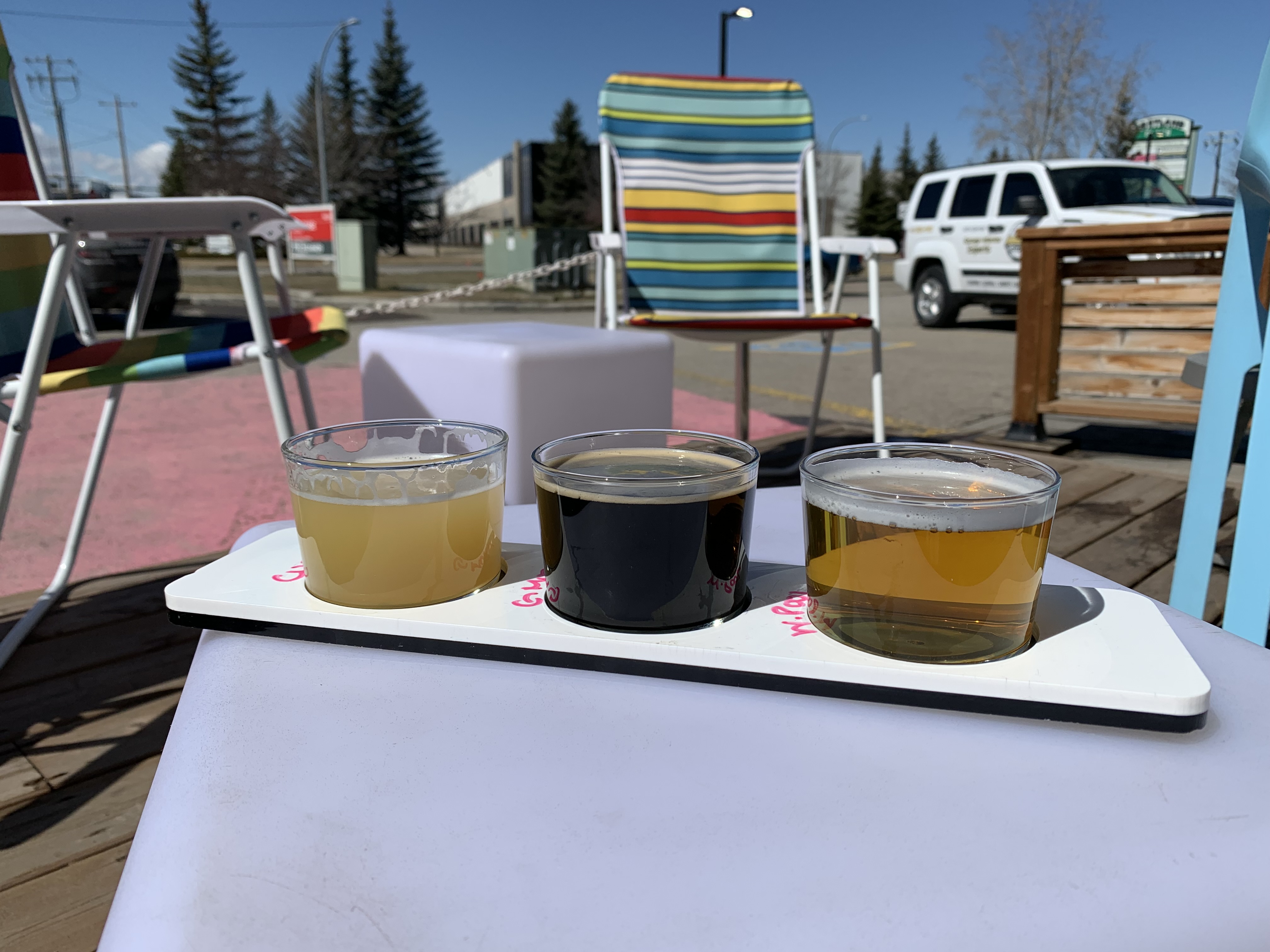 I hopped next door to Cold Garden to continue my decompression. The beers here were a notch below their neighbours with the exception of the vanilla porter beer on the far right below. What I loved about this taproom was their expansive outdoor patio including cottage-like furniture and a view of planes on takeoff from YYC. By the end of this tasting flight and an hour of watching plans takeoff and bank east or west on their journeys I had recharged my batteries.