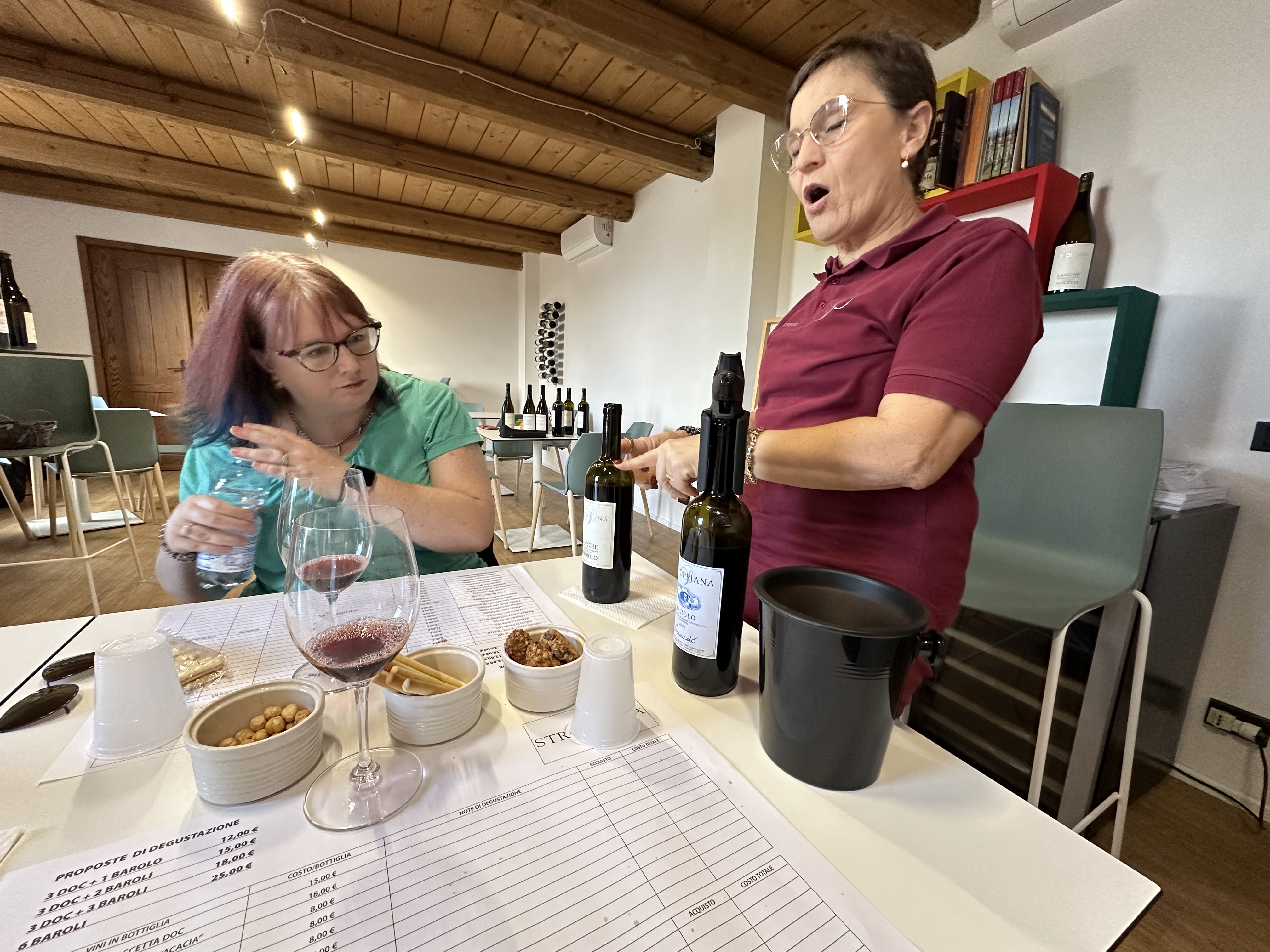In the tasting room the family’s matriarch described each of the wines we sampled and we had a lovely conversation while we sampled liberally. There were a couple of revelations here. First, a new to us grape, nascetta, made a huge impression. Stroppiana only makes a small amount of this and most of it is sold very locally. It was fresh and aromatic, unlike anything I have ever tasted, and warranted a bottle purchased for later enjoyment as we explored Italy. The other thing that was remarkable was the range and nuance of their Barolo wines. In Canada, commercially there’s lots of big, heavy Barolos, but the ones we were tasting at Stroppiana had a spectrum of expression that I had never tasted before. We were really blown away by the wines, the hospitality, and also the “small world” nature of learning that a few of their wines could usually be obtained in Alberta as the only place in Canada they sent a bit to.