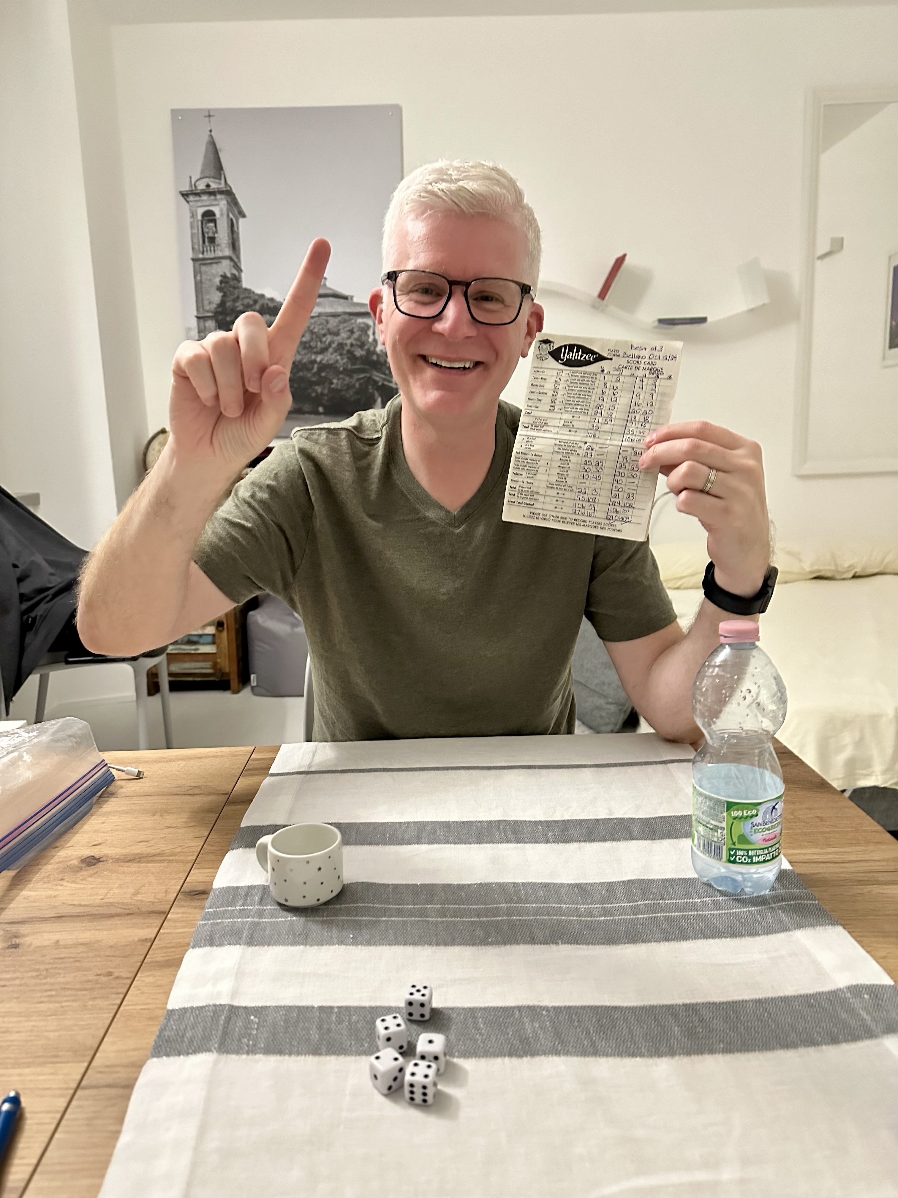 Back at our rental, we engaged in a Bellano Yahtzee championship. Fuelled by little glasses of limoncello from the bottle that we had brought along from our first night in Milan, my luck turned and this marked the start of a nice winning streak.