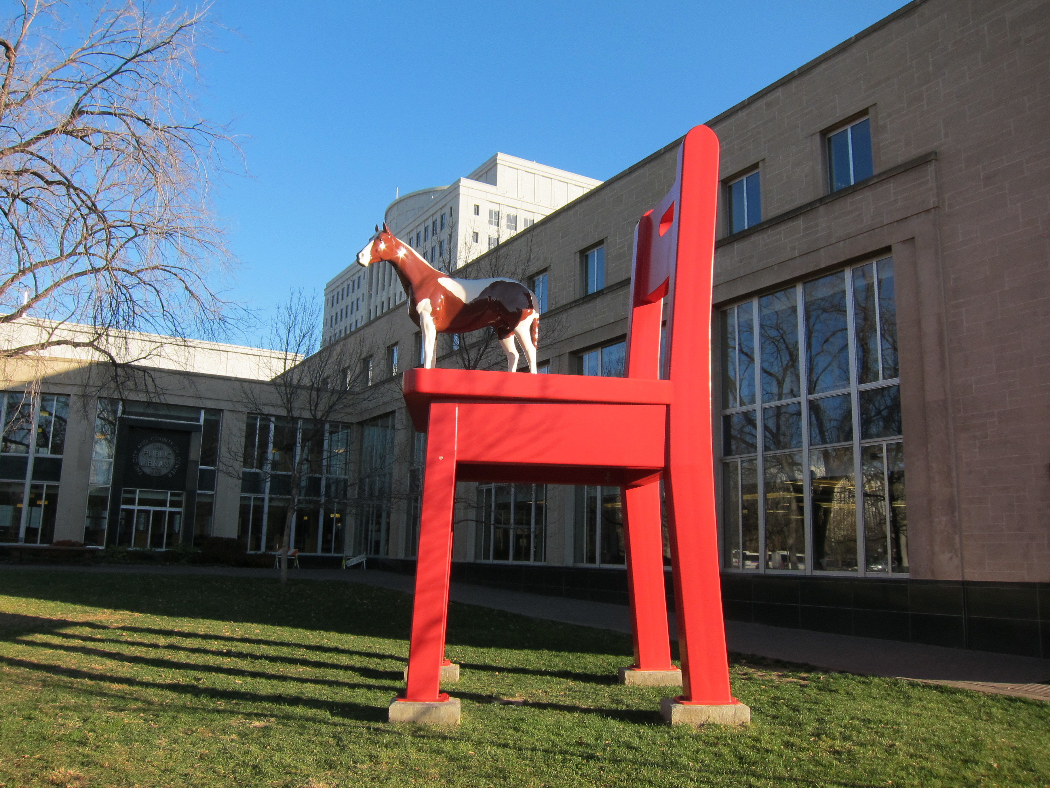 First, the striking “The Yearling” by Donald Lipski outside of their public library downtown. Indeed, a horse standing atop of a chair. Love this:
