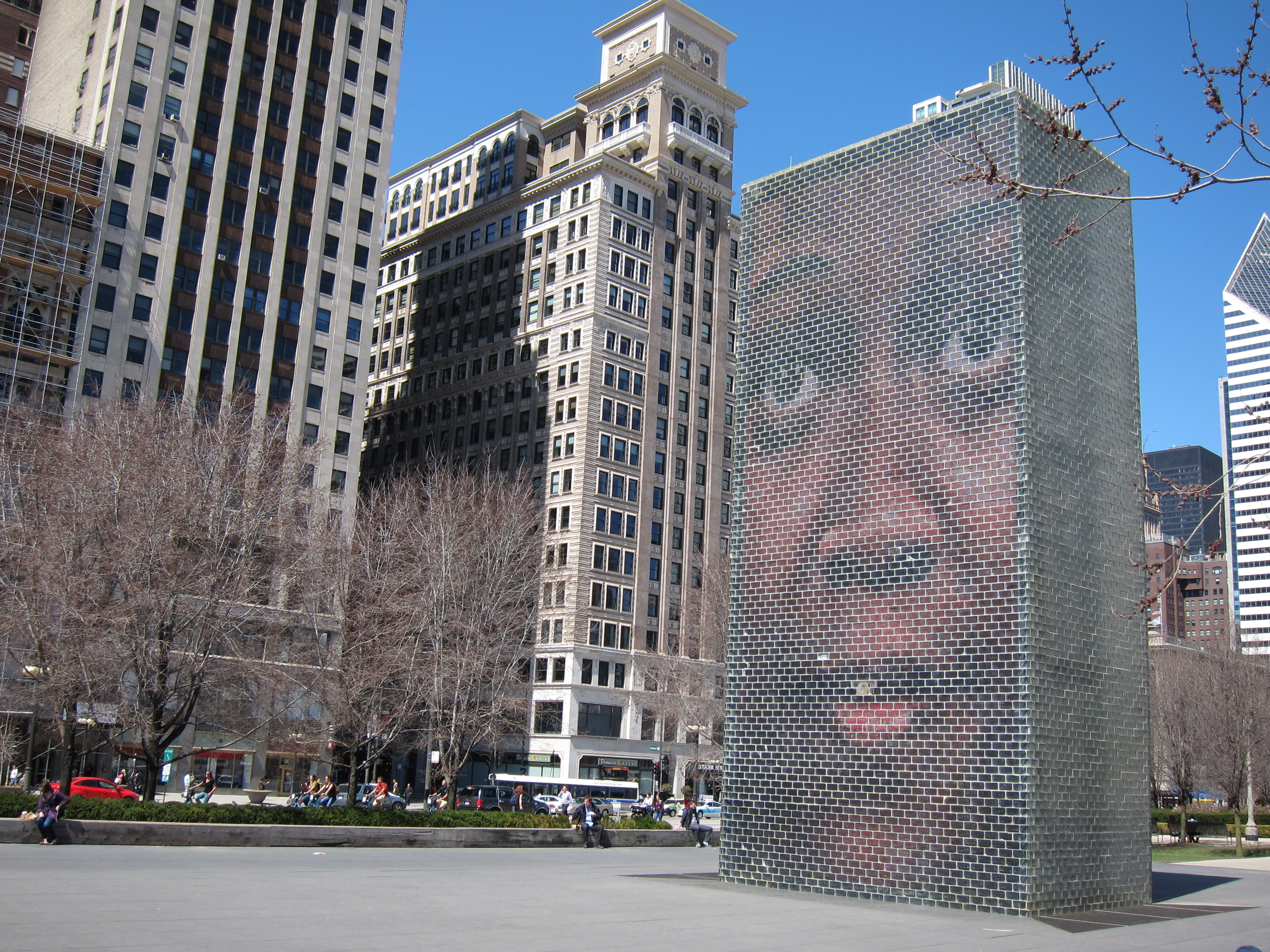 Just east of the loop is Millennium Park, home to some of the most iconic of Chicago’s public art, and the first stop on my self-guided tour. The first piece I took in was “Crown Fountain”. It consists of two large skyscraper shaped structures with images of Chicago natives projected on them. Sadly, the fountains spewing from the mouths of the projected images weren’t operational on my visit, but the art is striking nonetheless: